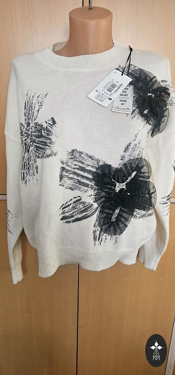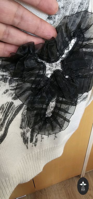 Very pleasant fabric, 50% viscose. With a light pearlescent shimmer and a beautifully sewn-on application.