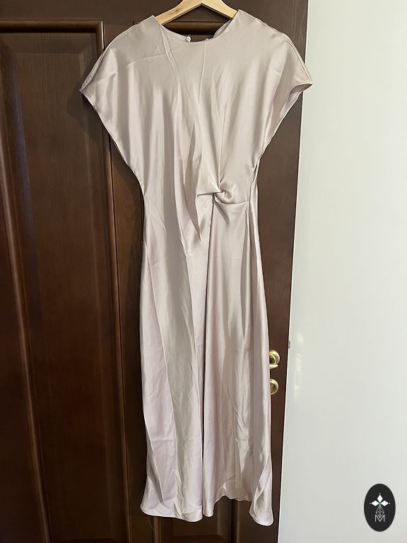 Kleita no viegla patīkama auduma, kurš viegli “ krīt”. Kleitas garums 120 cm. Vidusdaļa akcentēta ar iestrādātu joslas līniju.