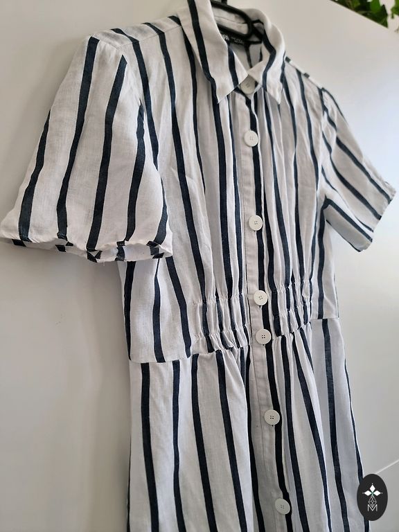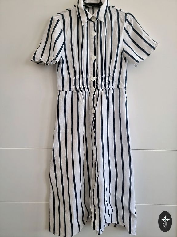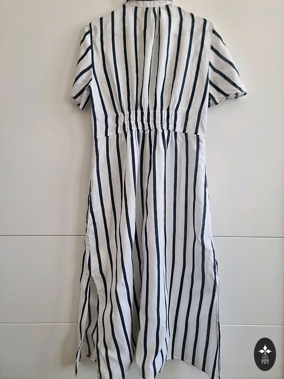 Tikrai graži lino apsiaustinė suknelė su nėrinių apačia. Kadangi yra užrišama, tikrai tiks nuo M iki XL dydžio. Rankovės raglano tipo. Diržą galima rišti tiek šonuose priekyje, tiek gale. Kišenės abiejose pusėse. Ką tik iš cheminio valymo. Puikios būklės. Ilgis 111 cm.