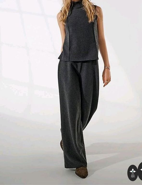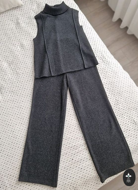 Tas ir ļoti stilīgs, efektīgs kostīms. Noteikti var izskatīties gan sievišķīgi, gan eleganti visos gadījumos. Mana fotogrāfija nevar parādīt visu šī kostīma "odziņu". Kostīms ļauj veidot stilu gan vakaram ar papēžiem, gan ar pus-sportiskām apaviem. Pirku izmēru S-M un augumu 170. Tagad mans izmērs ir XS-S, tāpēc tas uz manis mazliet karājas. Bikses ir brīvas, taisnas, ar kabatām. Žakete ir gara. Ļoti skaisti nokareni piedurknes ar atklātiem pleciem.