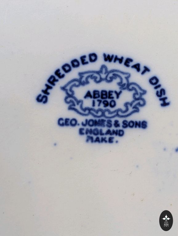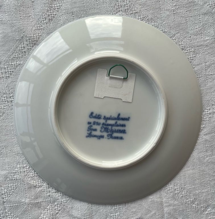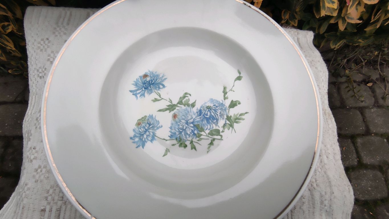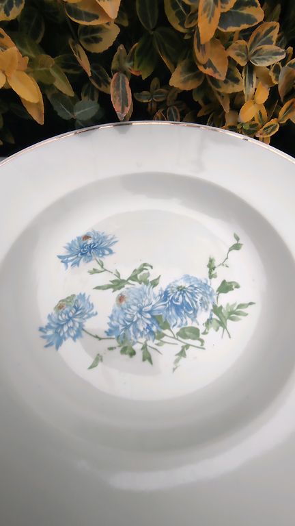 Balta fajansa pamatne ar tumši zilu ziedu rakstu un elegantu zilu līniju gar malu.