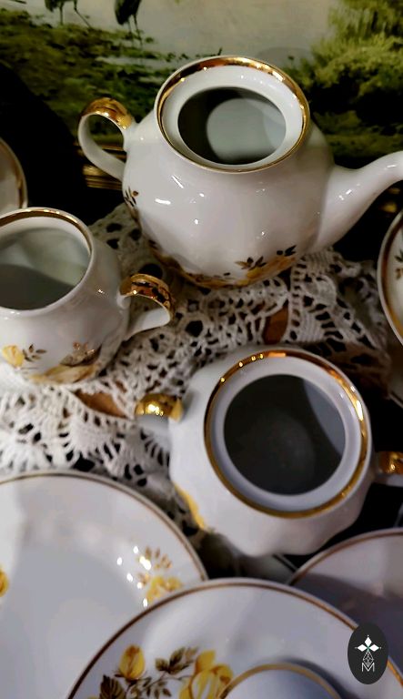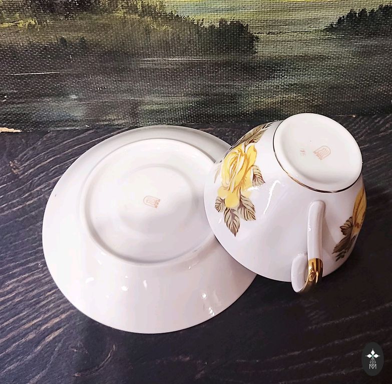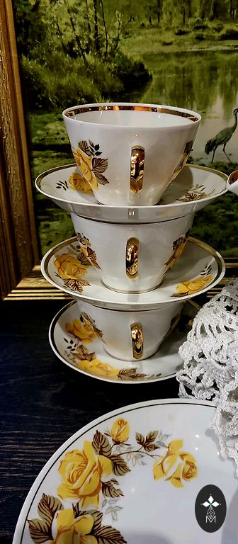 Porcelain factory Johann Seltmann, Vohenstrauss, Bavaria, 1945-1954. Porcelain coffee trio. In very good condition. Hand-applied decor. No cracks, chips, or gold loss. The black part shows minor signs of use. Cup D 10.4 cm, H 6 cm. Saucer 15.2 cm. Plate 19.4 cm. The item stands on a shelf and is not used. Adjustments to cupboard shelves.