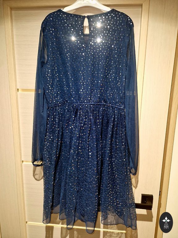 Темно-синее с небольшим блеском. Акценты на плечах. Указан размер 140. Подойдет начиная с 134./140 размера. Сзади молния. Для прохладной погоды.