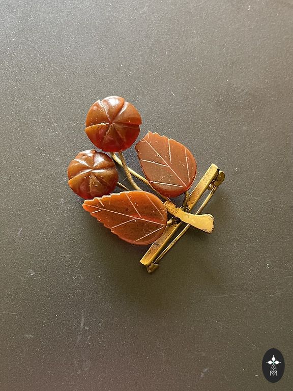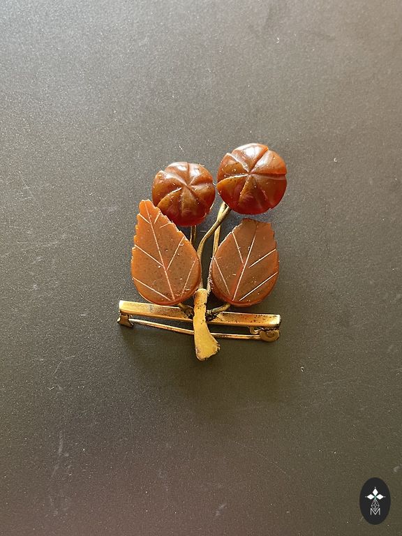 Vintage brošē ir izgatavota zirnekļa formā ar ķermeni un galvu no dabiskā Baltijas dzintara un pozeltota misiņa karkasa, 1963. gadā Kaliningradas dzintara rūpnīcā, zīmogs ЯК3, 5,82 g.