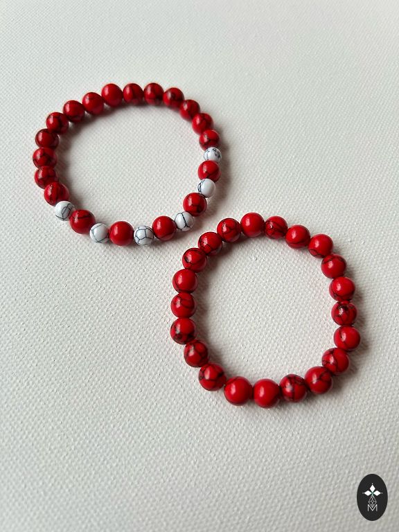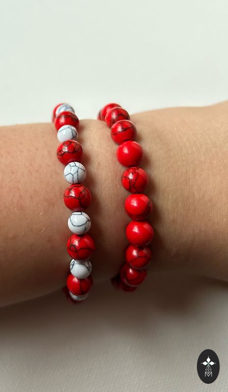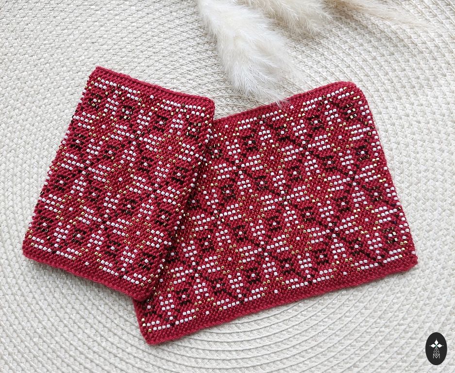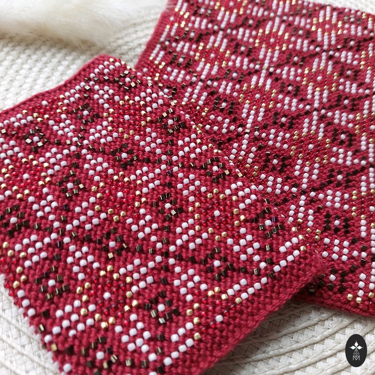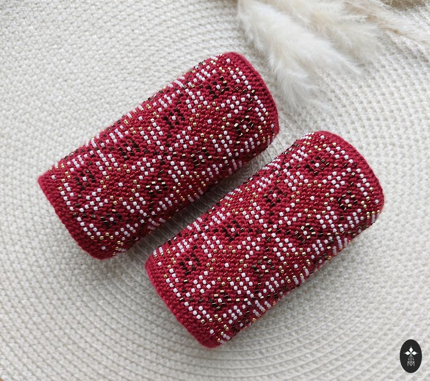 Very beautiful wrist warmers! For celebrations or everyday use. Carmine red with white and gold beads.
