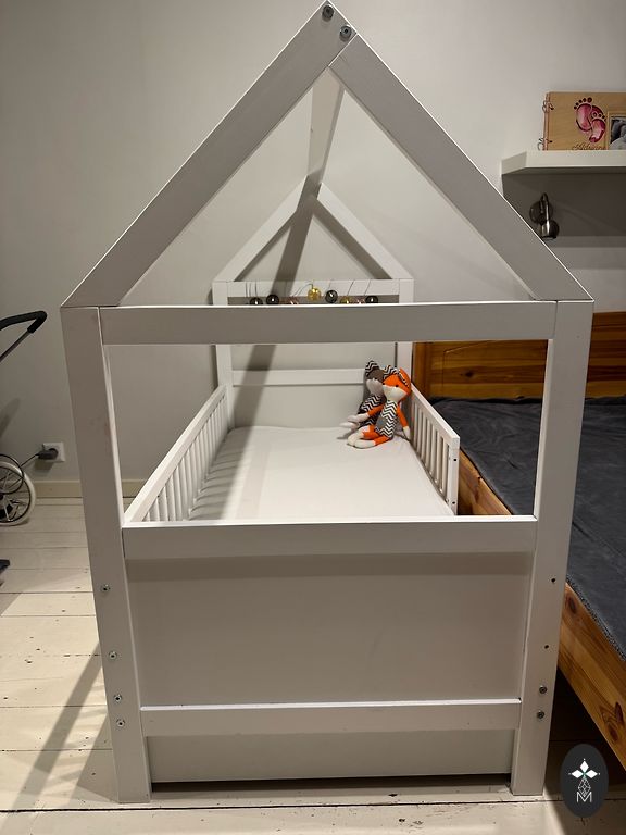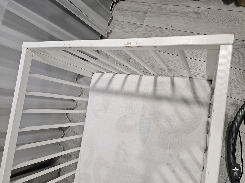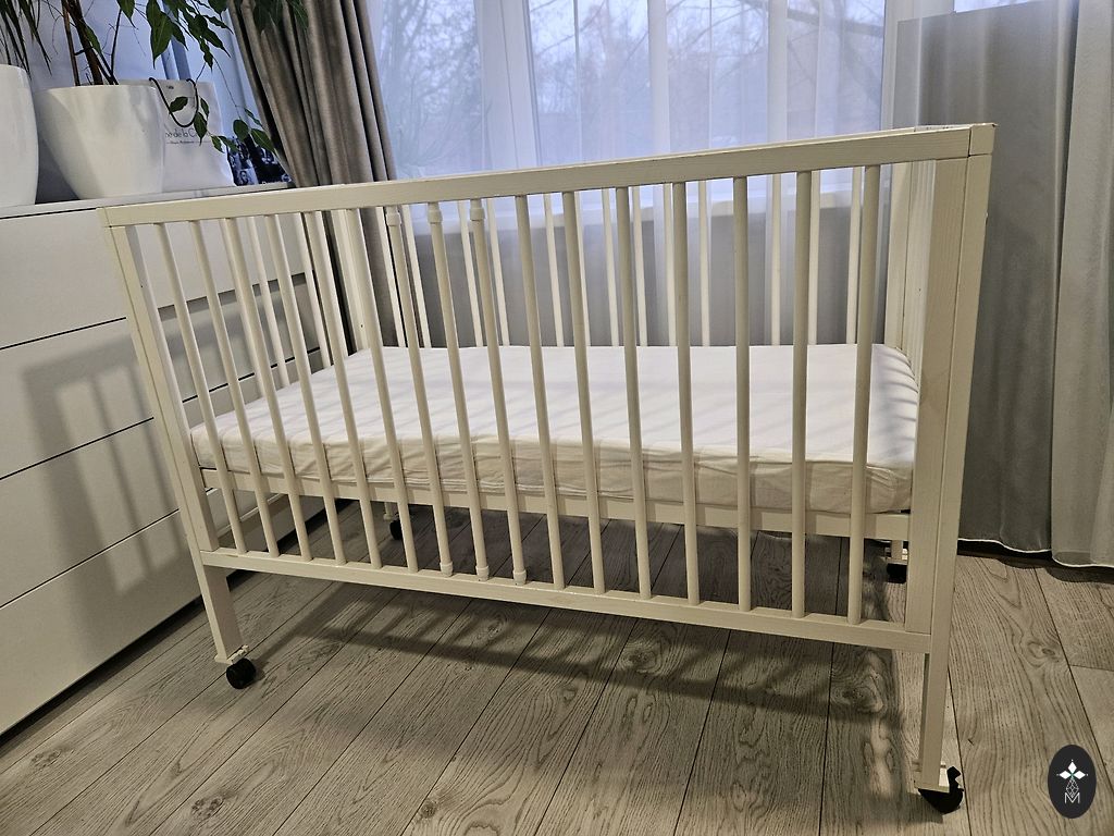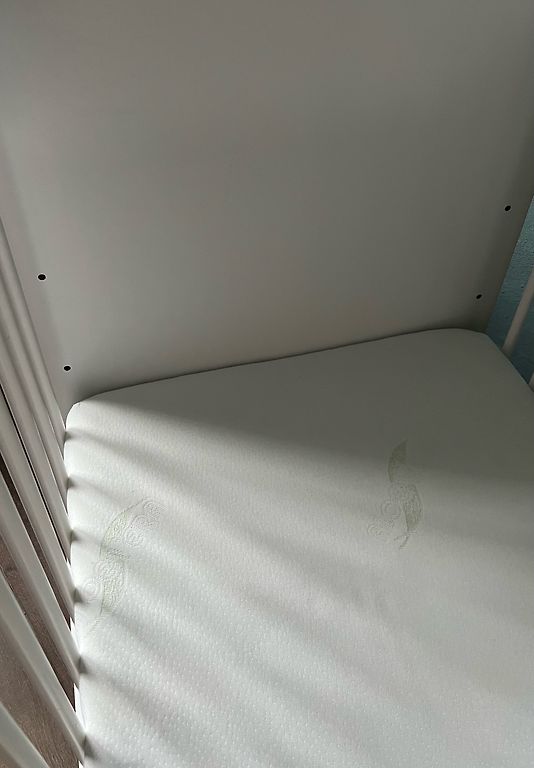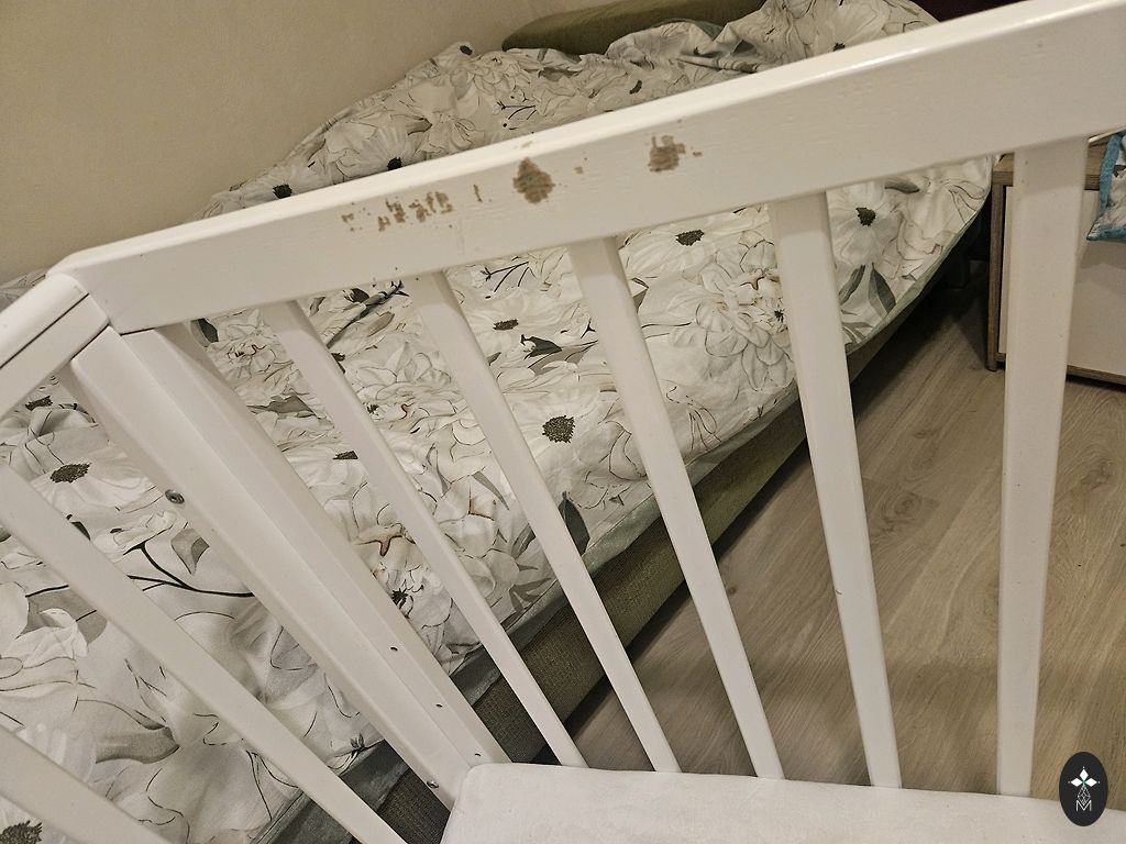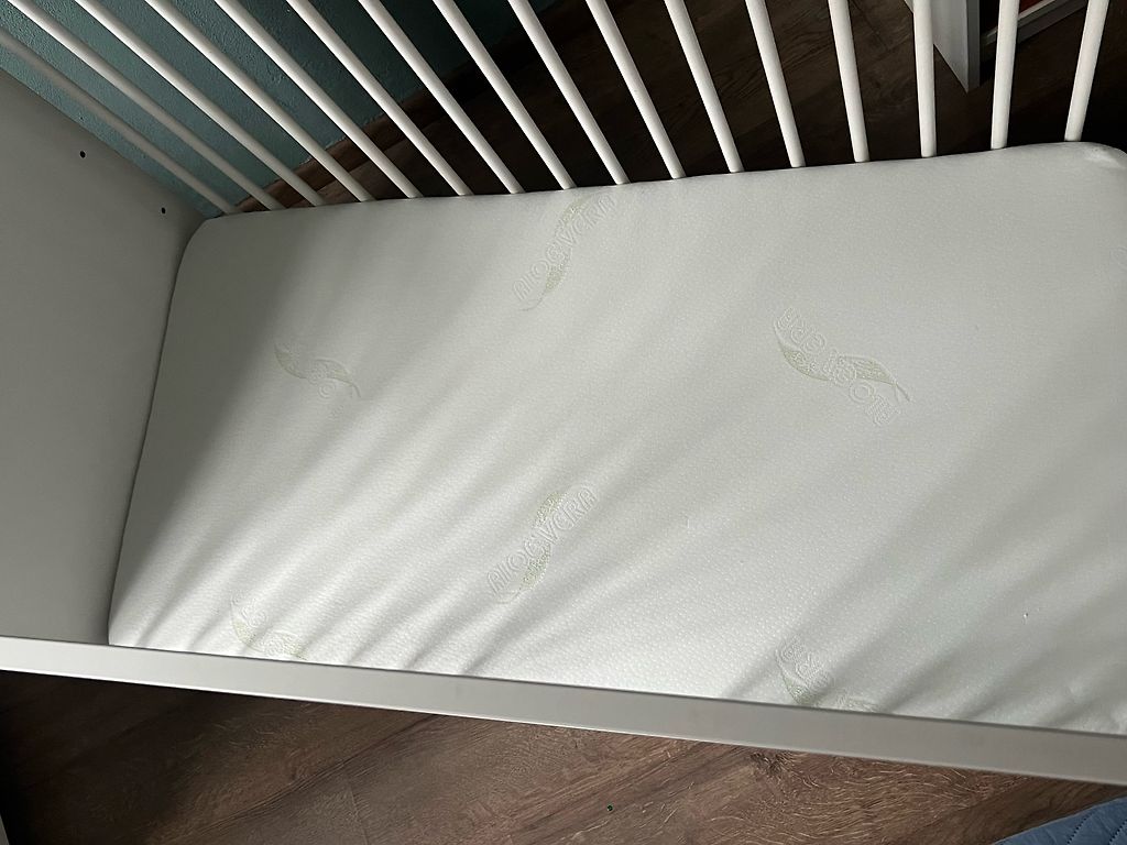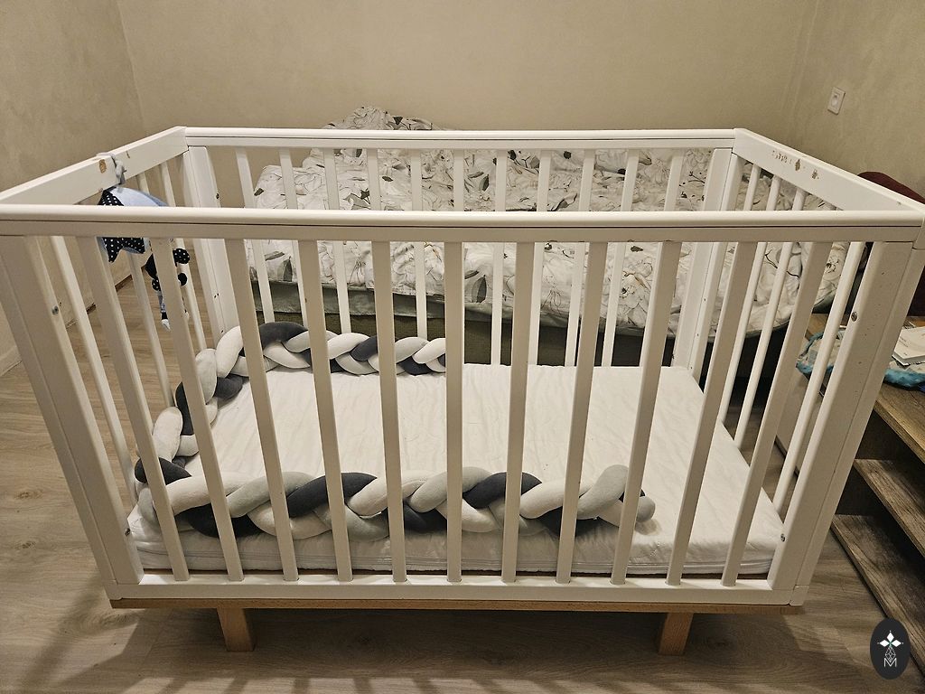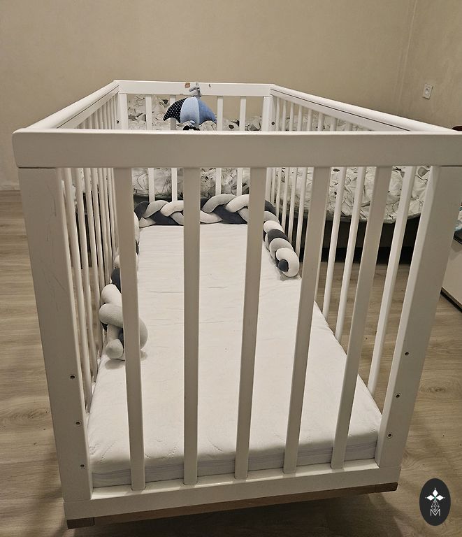 Võrevoodi saab ühe külje ära võtta ja lükata vanemate voodi kõrvale, aga võib ka jätta külge. Madrats on küll plekiline, kuid see ei sega kasutamist. Madratsi üks pool on tatra täidisega ja teine tavaline.