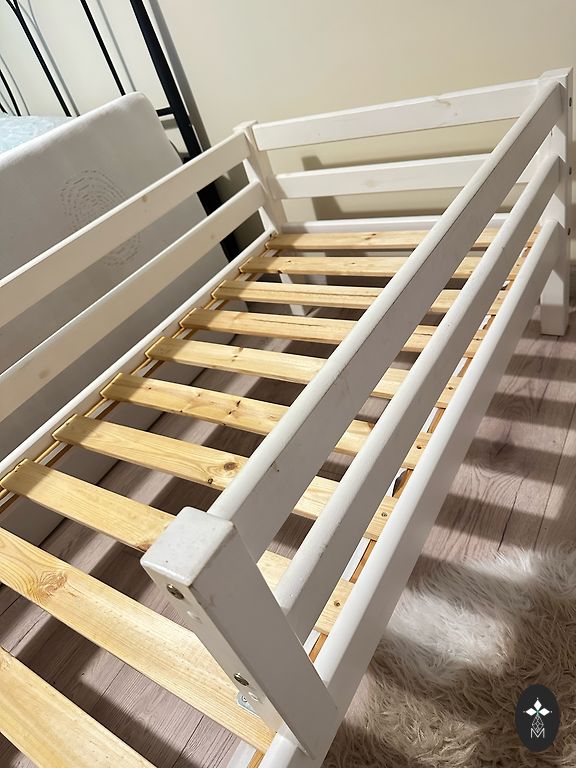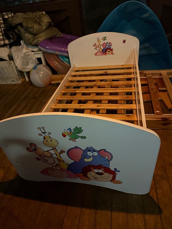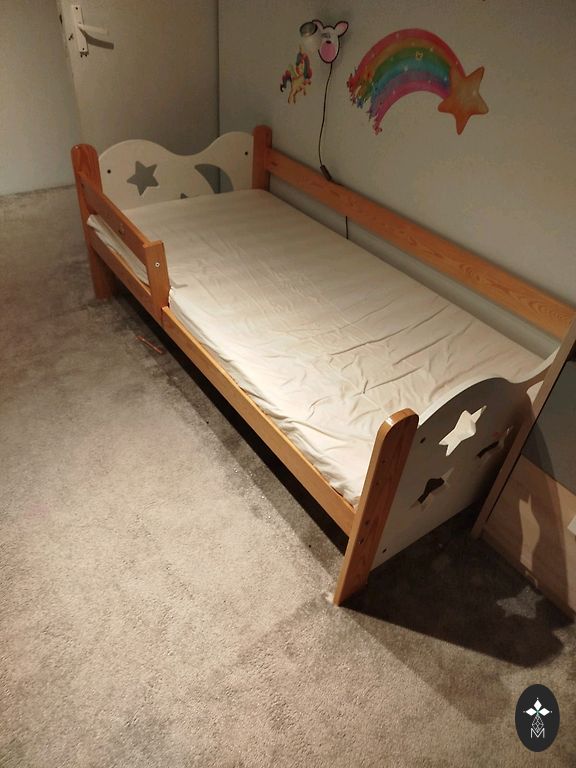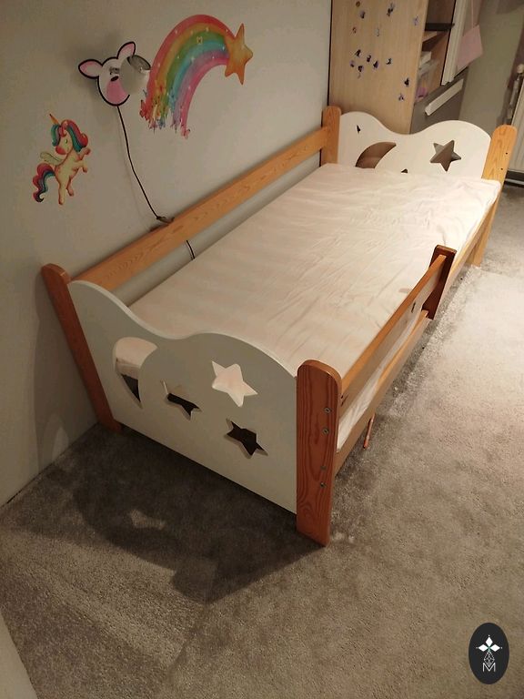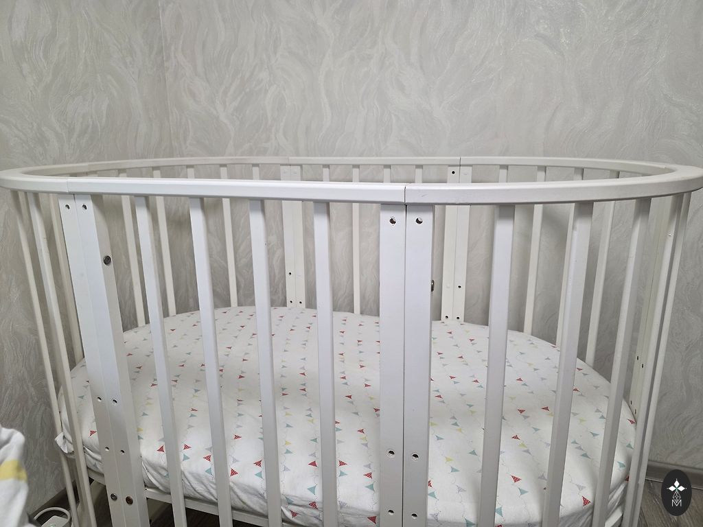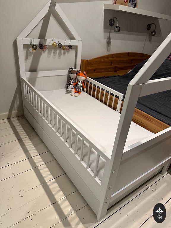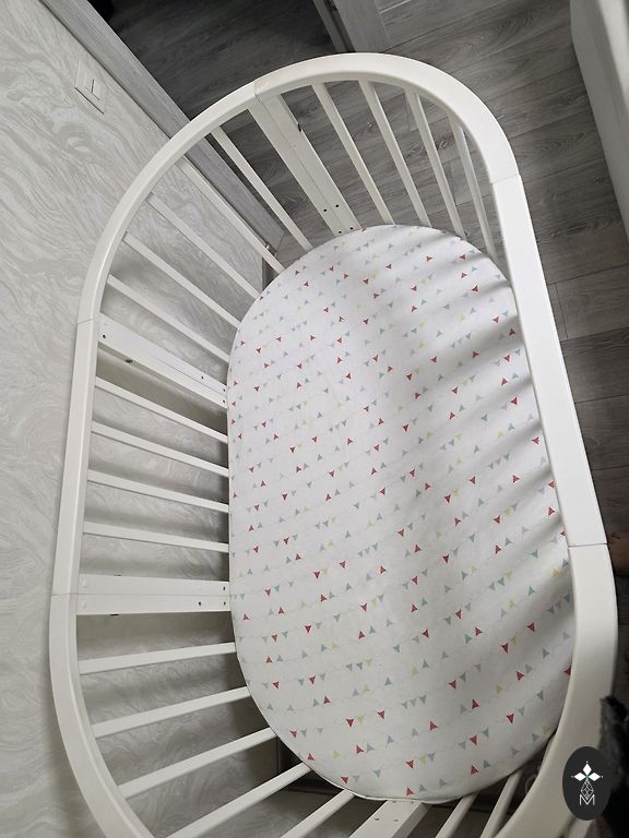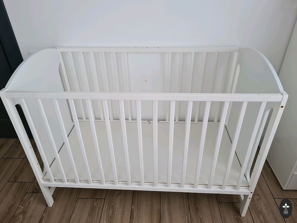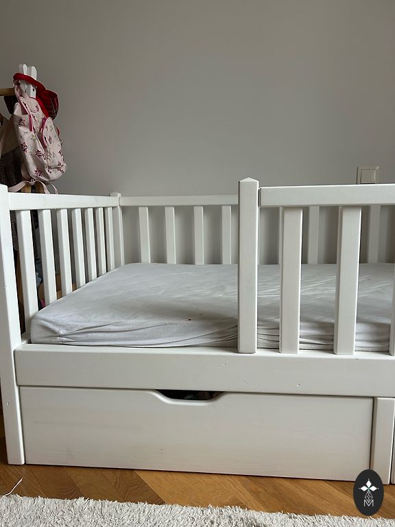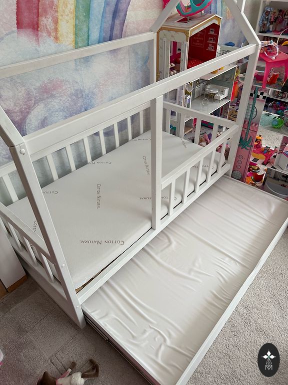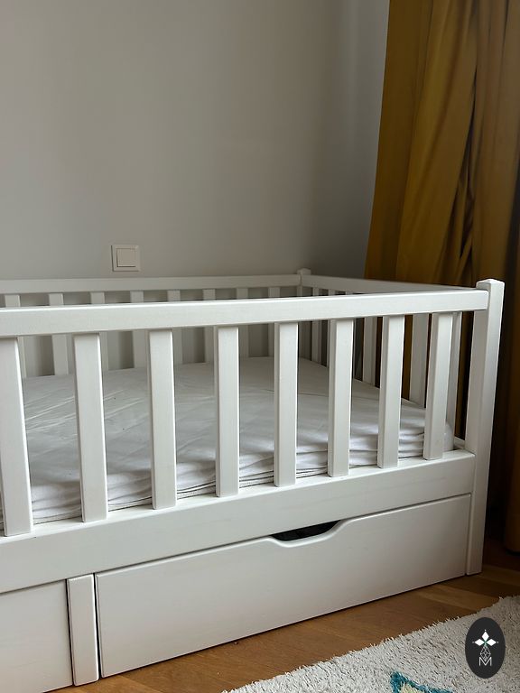 Võrevoodi saab ühe külje ära võtta ja lükata vanemate voodi kõrvale, aga võib ka jätta külge. Madrats on küll plekiline, kuid see ei sega kasutamist. Madratsi üks pool on tatra täidisega ja teine tavaline.
