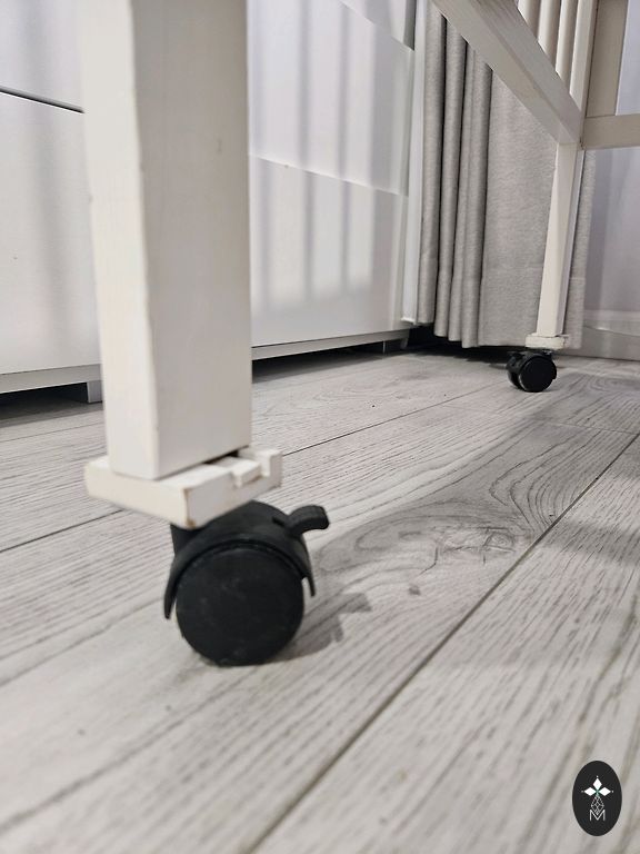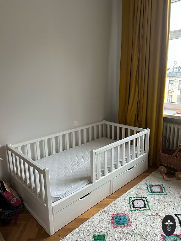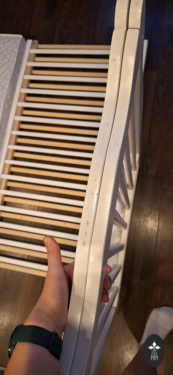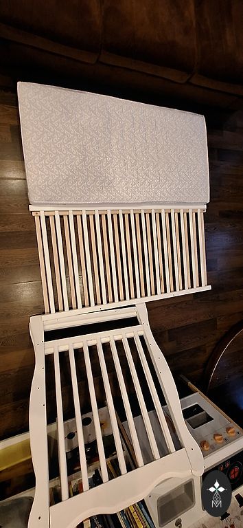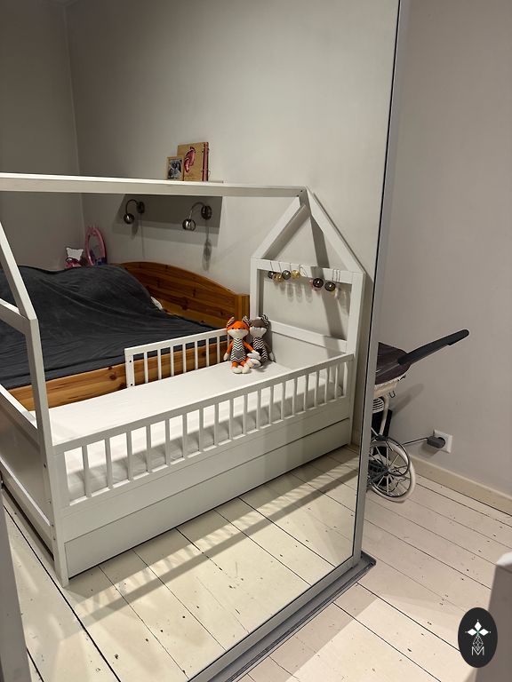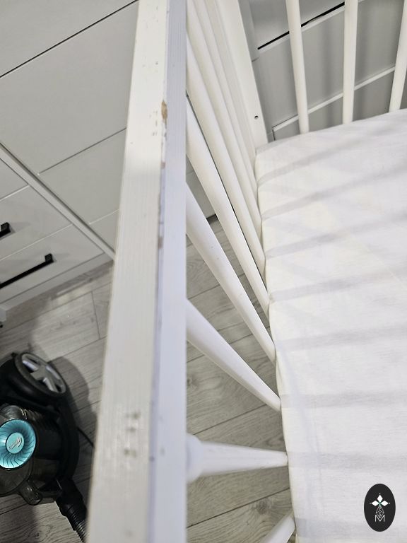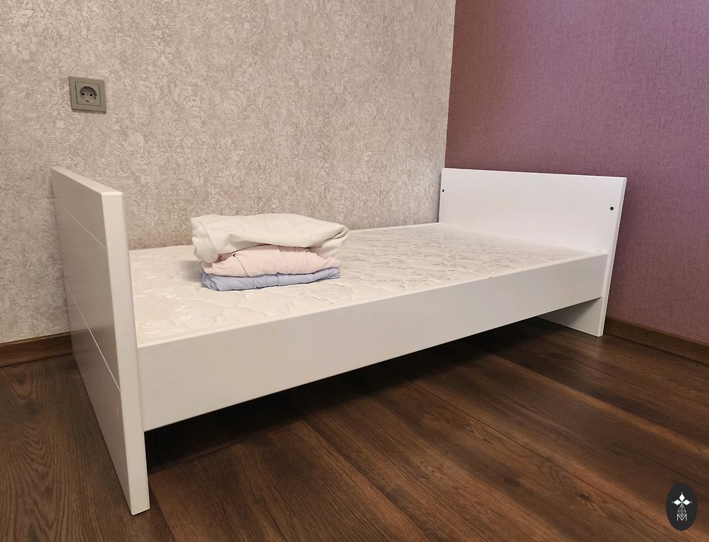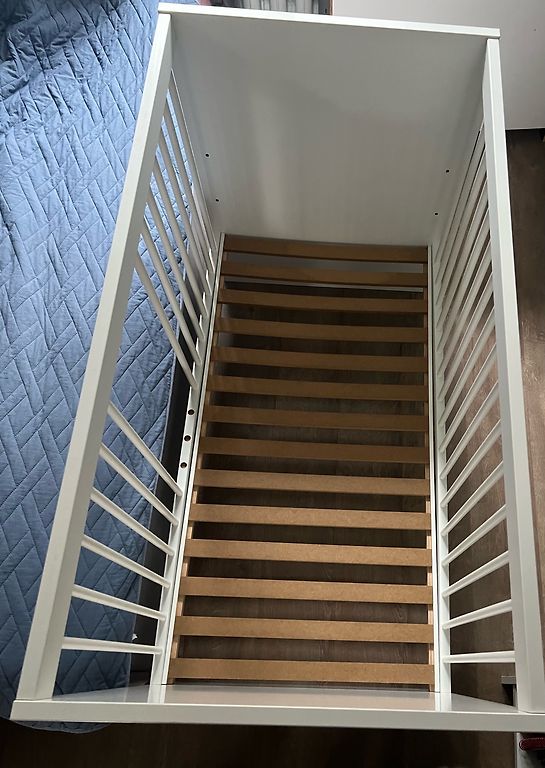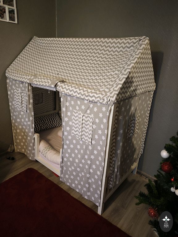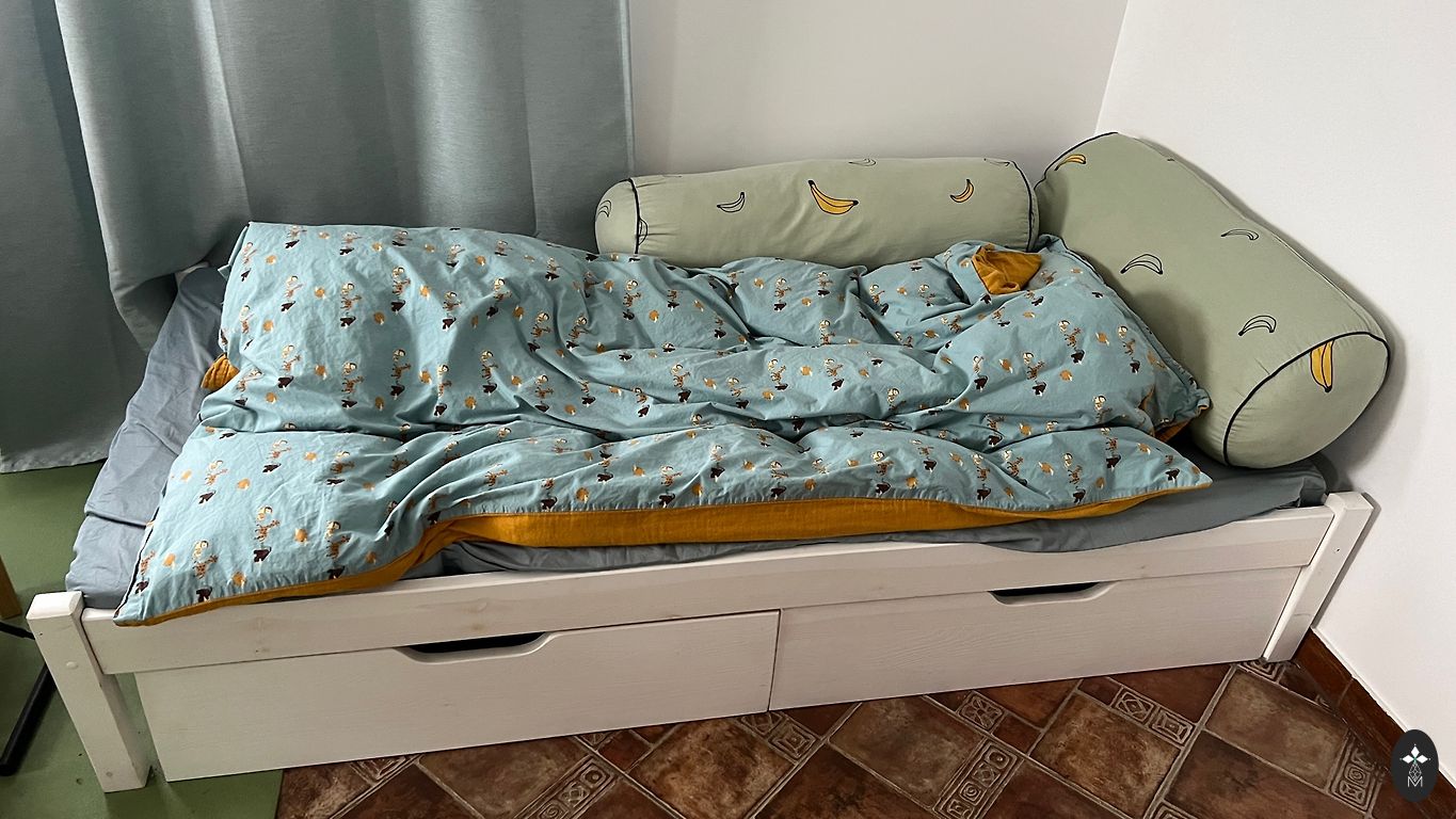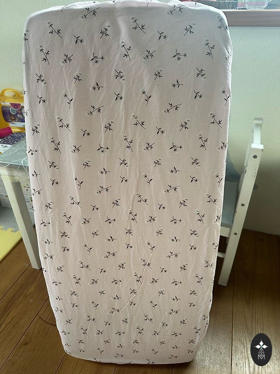 Võrevoodi saab ühe külje ära võtta ja lükata vanemate voodi kõrvale, aga võib ka jätta külge. Madrats on küll plekiline, kuid see ei sega kasutamist. Madratsi üks pool on tatra täidisega ja teine tavaline.