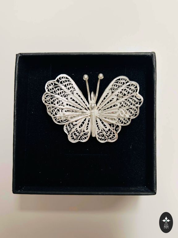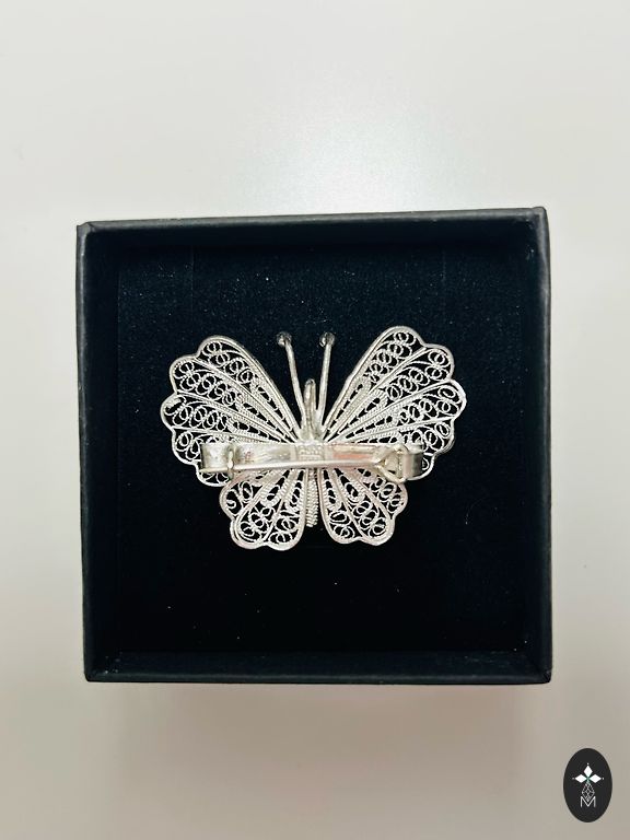 Elegantiškas, skulptūrinės formos metalinis segtukas su blizgiu chromuotu paviršiumi. Tekančios linijos ir šiuolaikinis dizainas suteikia jam išraiškingą akcentą prie šaliko, palto ar suknelės.