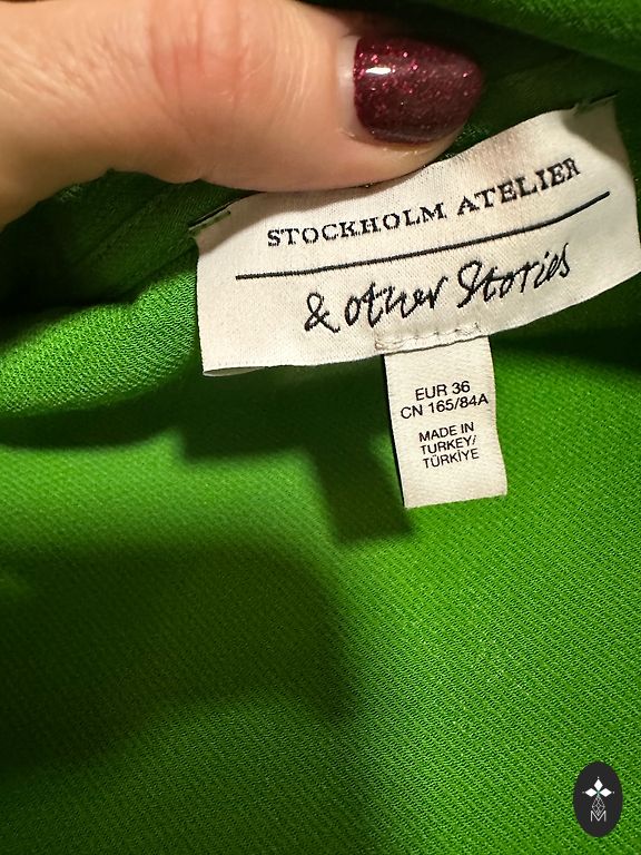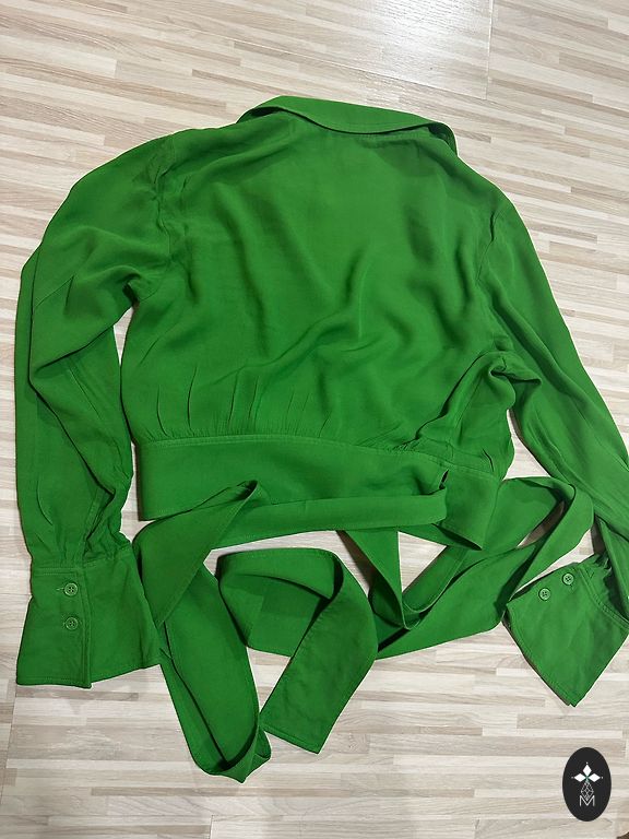 Kerge, kortsuvaba, ere roheline. Valitud materjal. Kaetud nööbid. Külgedel veidi lühendatud. Kantud üks kord.