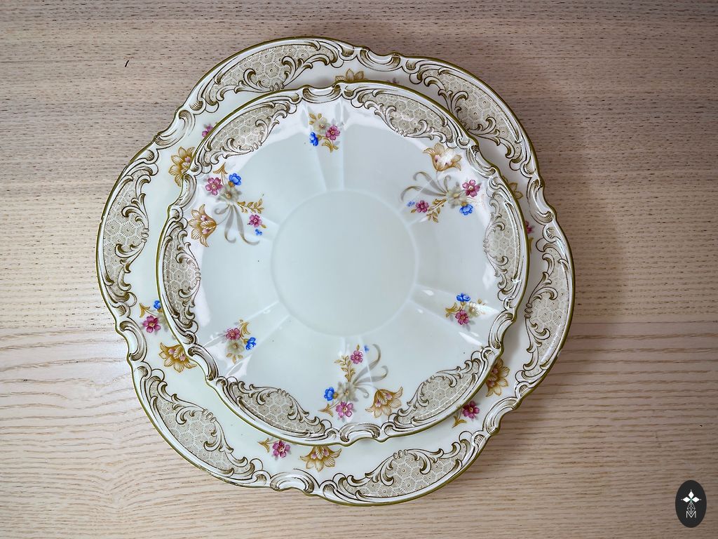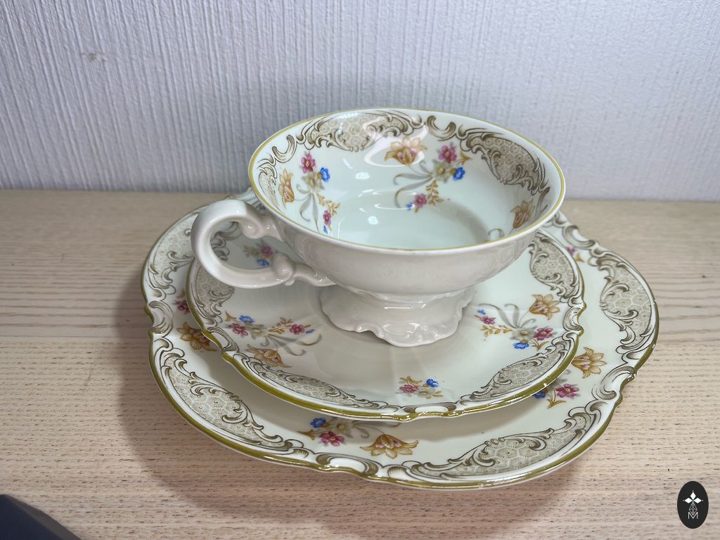 Antikvārs tējas trio "Mitterteich Bavaria". Vācija. 20. gadsimta pirmā puse. Krūze: augstums 7 cm, tilpums 200-220 ml. Apakštase: Ø 15.6 / 20.4 cm. Bez skaldījumiem un plaisām. Iepakoju droši.