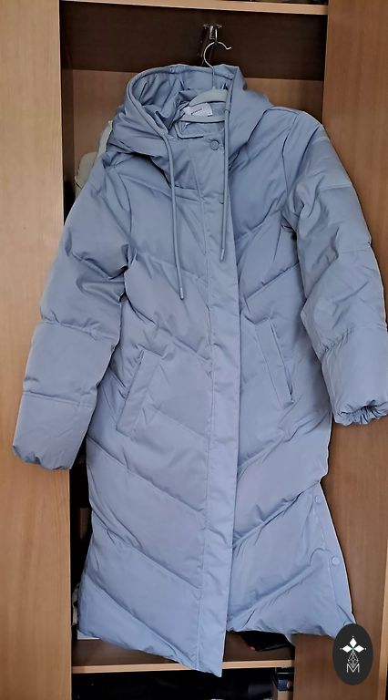 Warm, voluminous quilted coat. Double zipper. Large, adjustable hood. Pockets, inner pocket. Cuffs for hands. Sides can be tightened. Ideal for ML size. Color dark gray with pink. Length 113, chest up to 112.