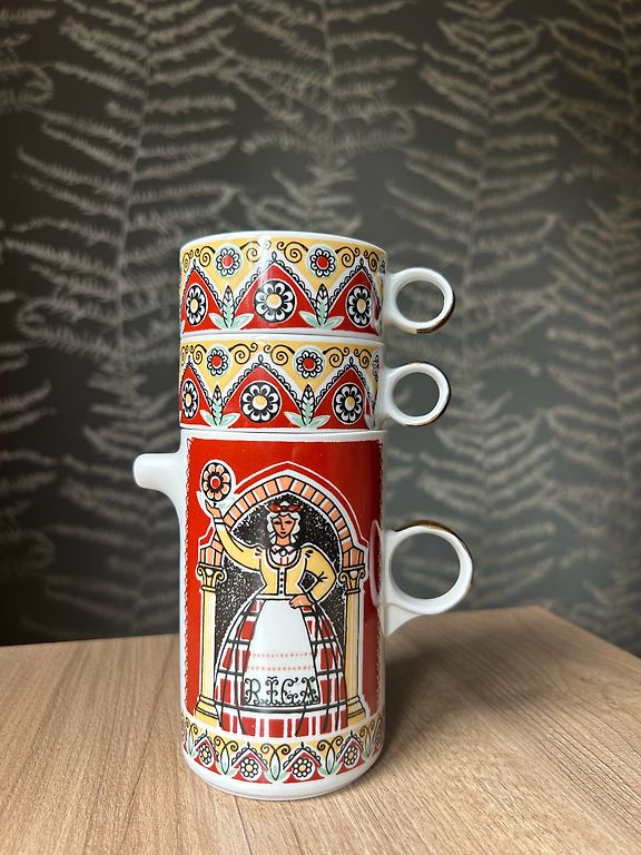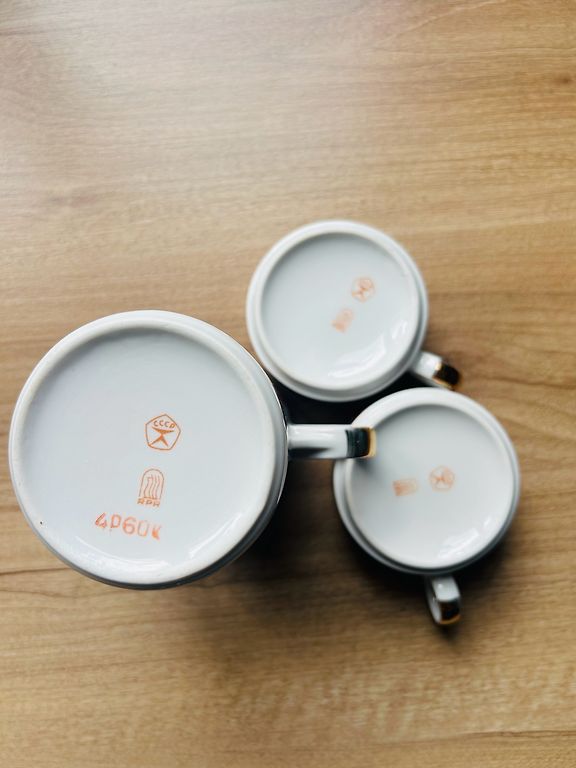 Porcelāna kafijas trio. Ļoti labā stāvoklī. Plaisu, nošķēlumu, zelta zudumu, būtisku lietojuma pēdu nav.
