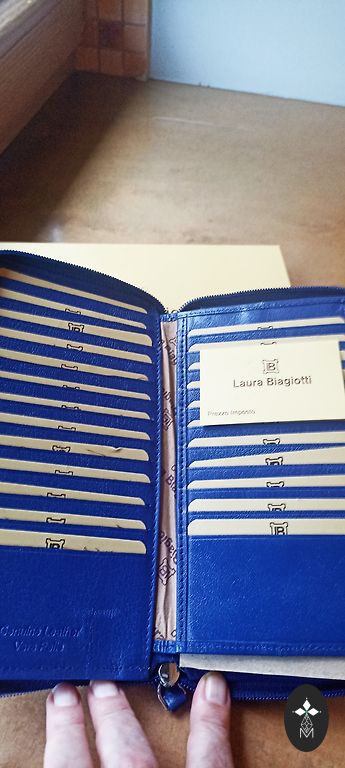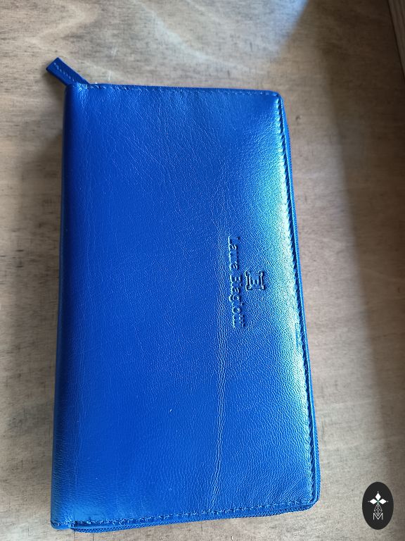 A completely new wallet, beautifully blue, made of genuine leather.