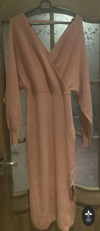 Pikkus 120 cm õlast. Rinna alt 110 cm. Pikad varrukad. Kangas nagu peen samet, tõelist värvi ei saa tajuda, rohkem vanaroosa poole.
