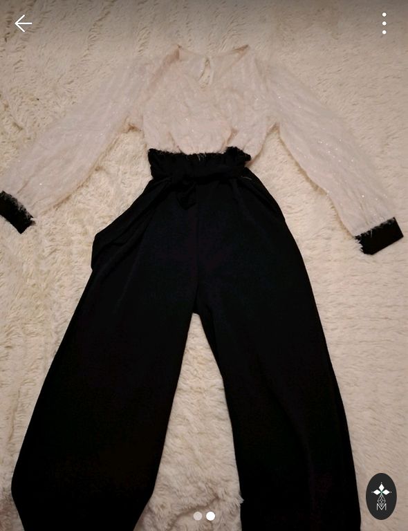 Skaisti neburzigi, skaisti kritosi svarcini ar oderi. Poliesteris, acetats. Viduklis 86 cm, garums 77 cm. Balta, kreklveida bluzite. Kokvilna, poliamids, elastans. Krutis 112, garums 64 cm.