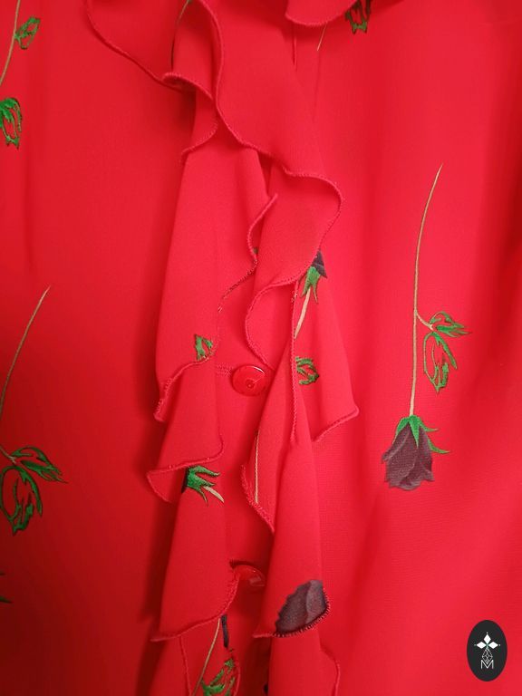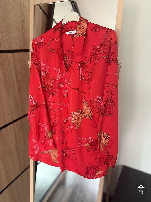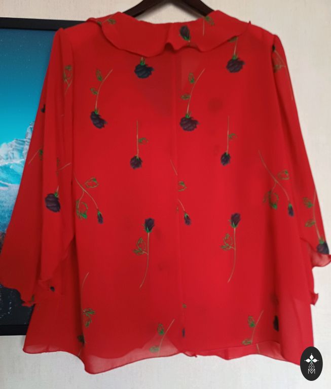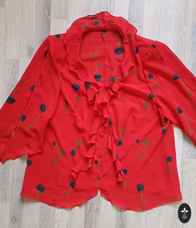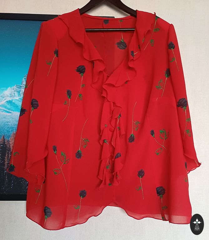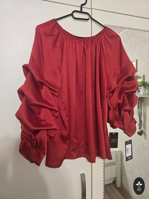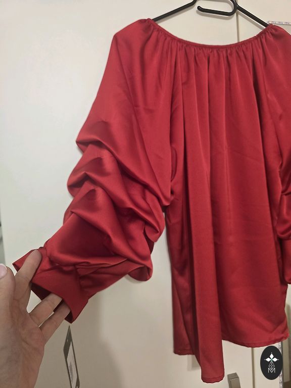 Ярко-красная блузка.