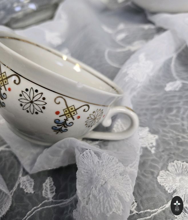 Rinkinys iš 2 puodelių ir lėkštelių su drugeliais.