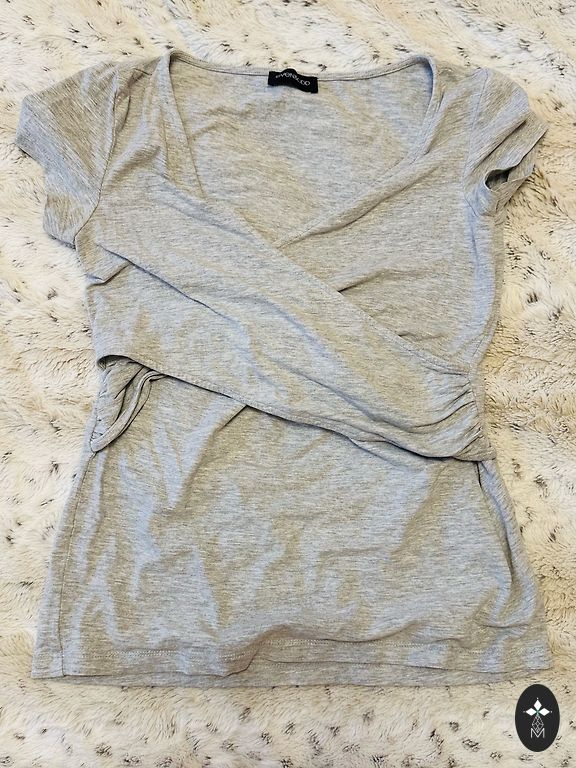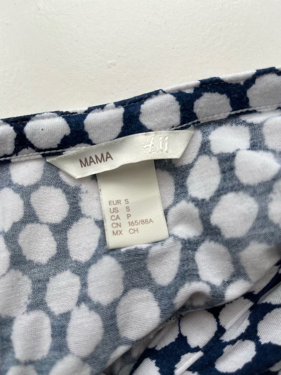 Tamsiai mėlynos/baltos spalvos dryžuotas nėščiųjų marškinėliai ilgomis rankovėmis. Specializuotas susitraukimas ir pratęsimas pilvo dalyje, kad marškinėliai tiktų visą nėštumo laikotarpį.