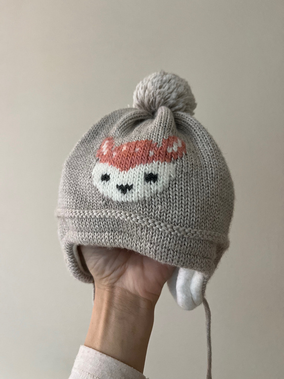 Sasienama, ļoti labi nosedz austiņas un pierīti. Nēsājis viens bērniņš, ļoti labā stāvoklī.