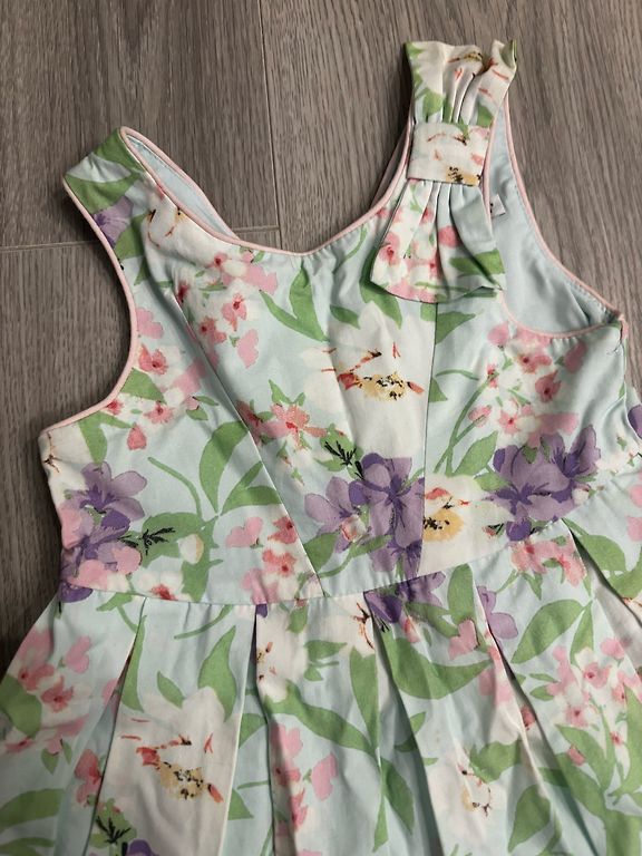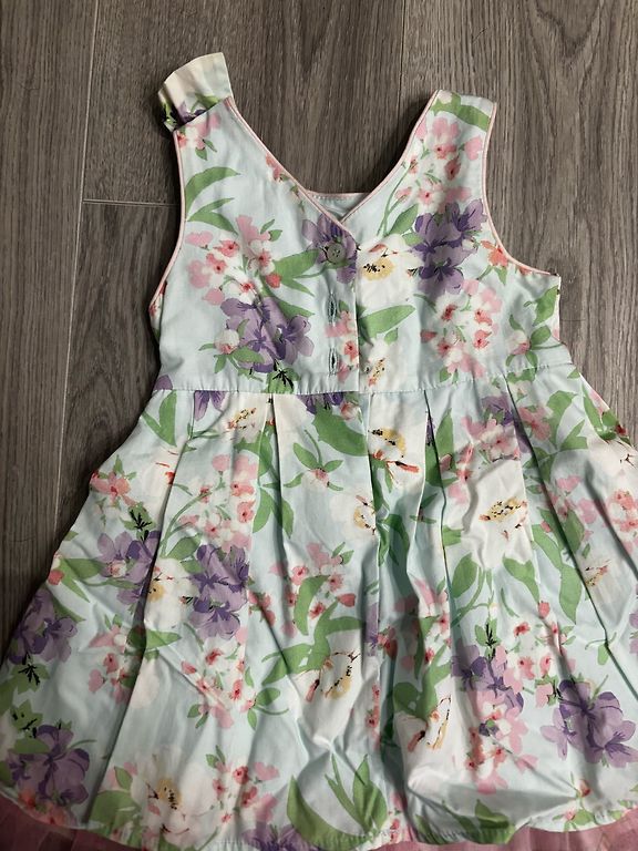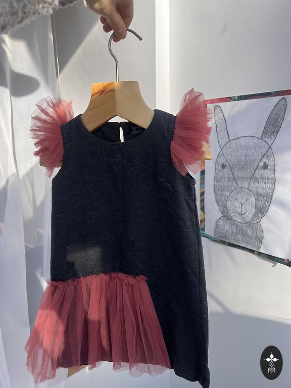 Kleita šūta no augstas kvalitātes kokvilnas trikotāžas, papildināta ar tillu vienā kārtā. Kakla izgriezums apstrādāts ar elastīgo manžeti vieglai kleitas uzvilkšanai.