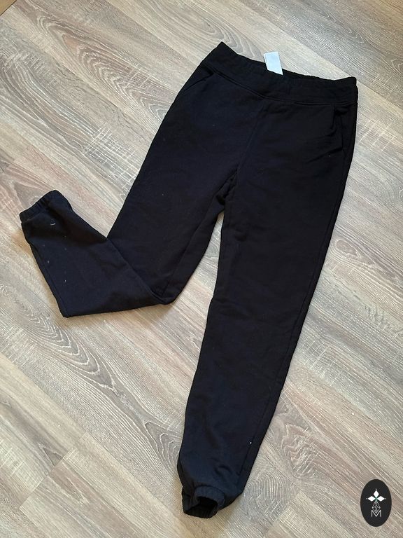 Ādas džogeri, lai gan rakstīts 34 izmērs tie ir oversaiz un derēs līdz pat M izmēram, S - noteikti. Viduklis uz gumijas , galu sānos rāvējslēdzīši. Bikšu garums 100 cm, gurnos 49, viduklis stiepjas, bet neizstieptā stāvoklī 38.