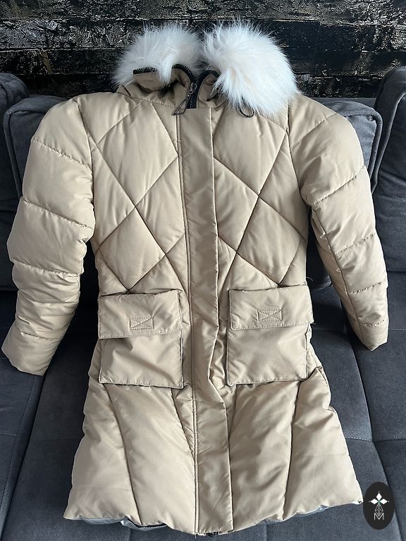 Natural down jacket, filled with goose down. Natural removable fur along the entire length. New, size M, loose and lightweight.