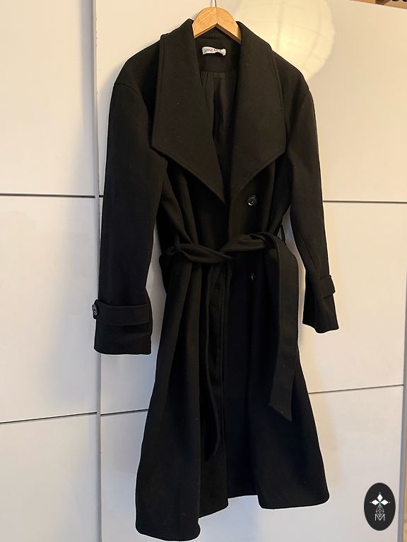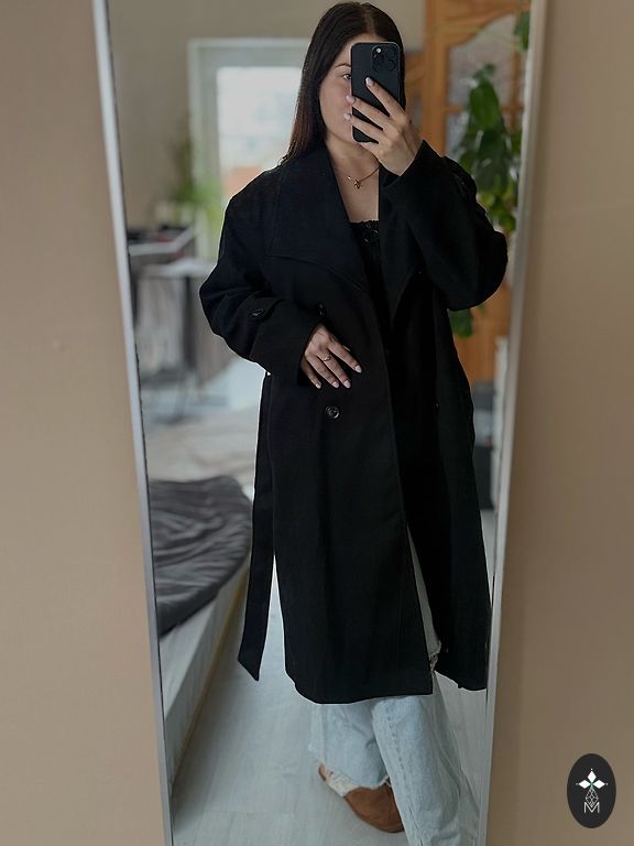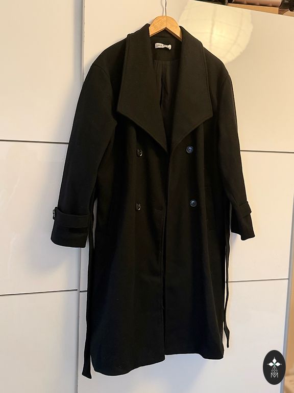 Izmērs 44. Parametri: pleci 42, zem padusēm 52, piedurkne 65, garums 93. Uz rāvēja, divas sānu kabatas, noņemama mākslīgas kažokādas kapuce. Līdz gurniem dubultsiltināts. Aizmugurē vidukļa zonā var koriģēt platumu. Apakšā arī savelkamās lentes (var veidot kupola formu).