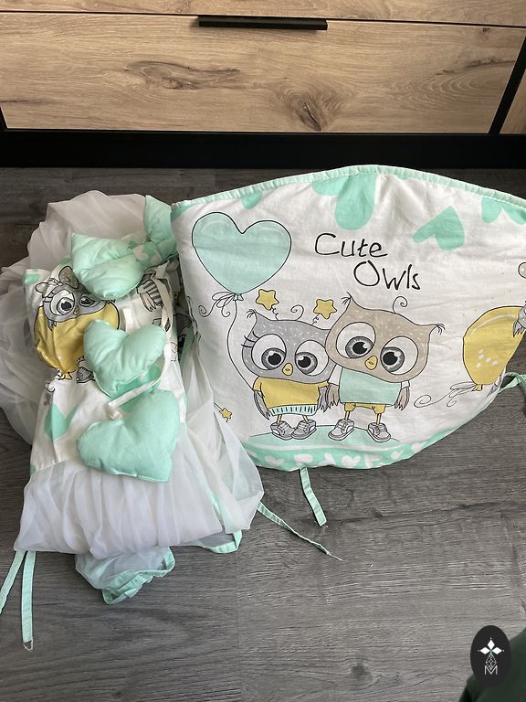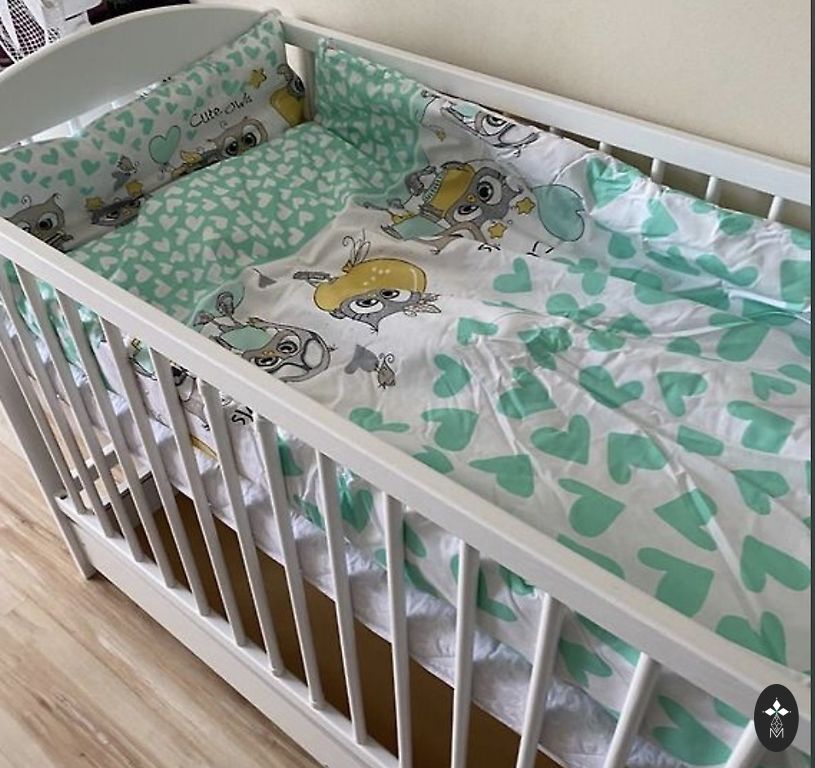 Used for one baby, very slight scratches, no other defects, mattress 120x60 - not stained, as we used diapers. Adjustable to 3 heights, drawer at the bottom. 2 middle slats are removable. There is a bedding set: pillow and pillowcase - 40x60cm, blanket, duvet cover - 120x90cm. Protector for the sides of the crib - 360cm, all cotton. Canopy - tulle, canopy holder. There are also extras if interested - 2 fitted sheets, 2 pillowcases, duvet cover. Purchased: https://www.ricaveikals.lv/product/lv/komplekts:gultina-jaundzimusajam-velas-komplekts-dabigs-koks-rabbit-tirkiza/120