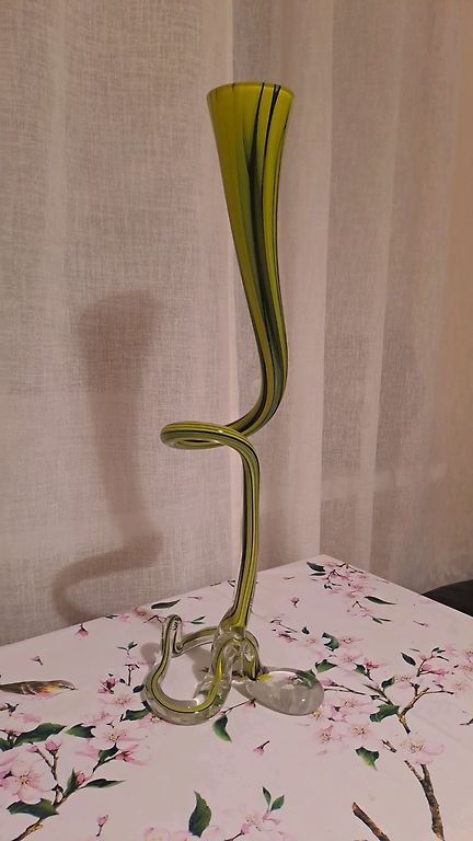 Ваза из стеклянной массы. Ее внешняя часть непрозрачная, но основание прозрачное, как будто зеленая ваза находится внутри. Снаружи она немного шершавая, но внутри гладкая. Высота составляет 45 см, диаметр основания около 15 см. Ваза находится в идеальном состоянии. Элегантная, красивая, устойчивая и очень качественная. Ручная работа.