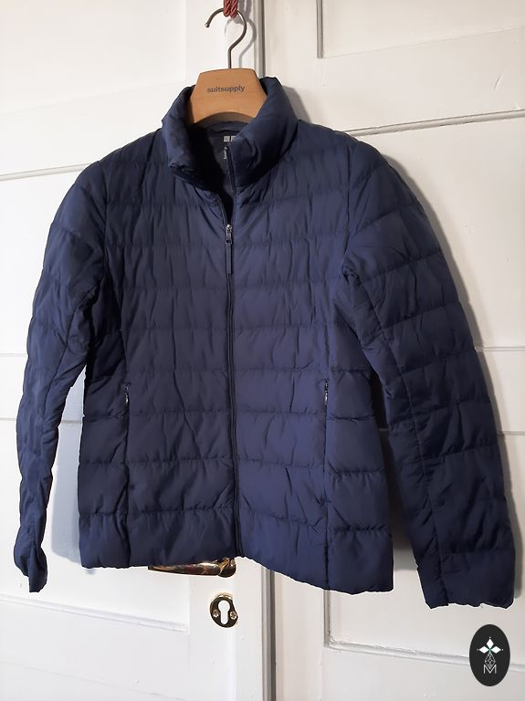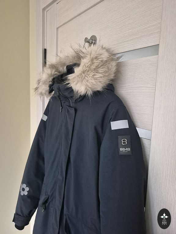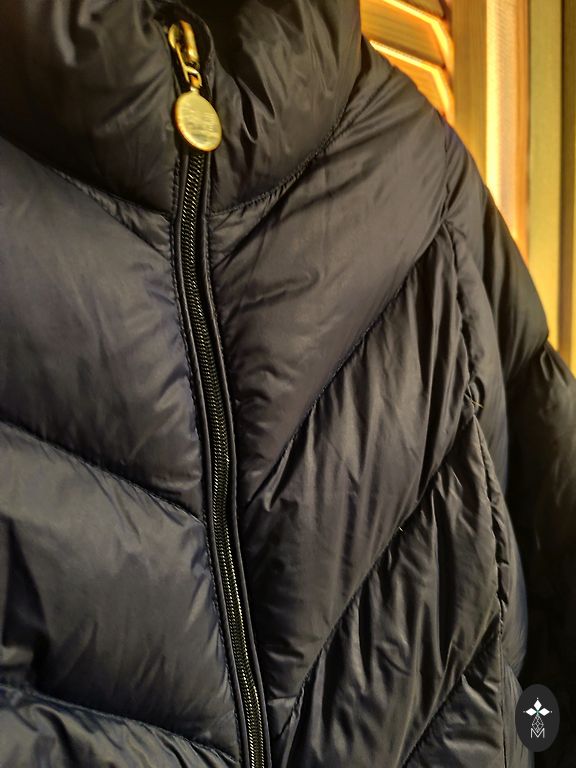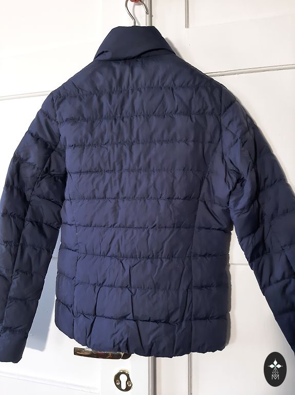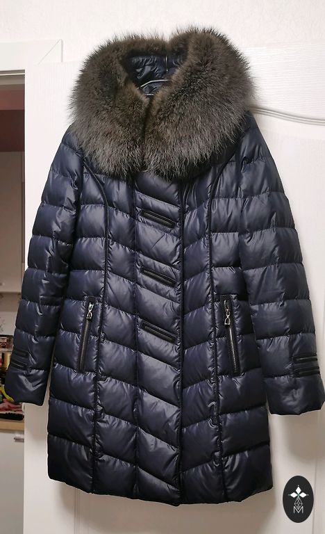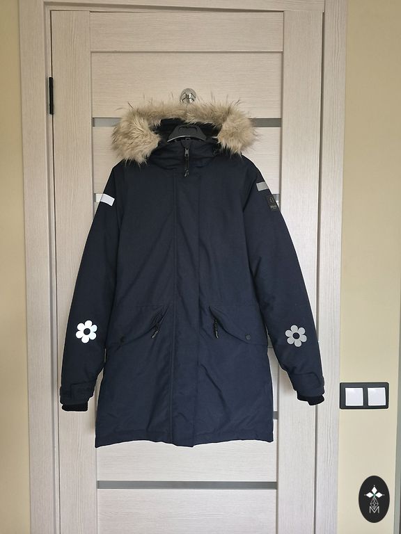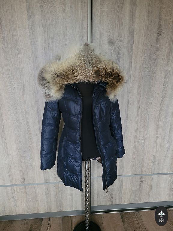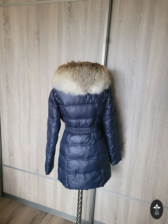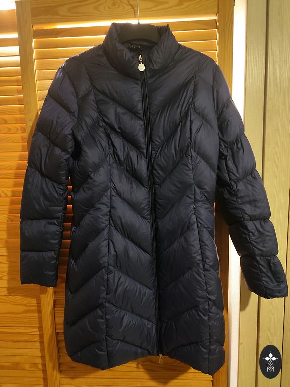 Tumesinine sulejope kapuutsiga. Kapuuts ei ole eemaldatav. Kantud ainult uks kord, kuna on jäänud liiga suureks. Väga soe ja kerge. Ees kaks taskut tõmblukuga. Pikkus-120 cm, kaenlaalused 57 cm.
