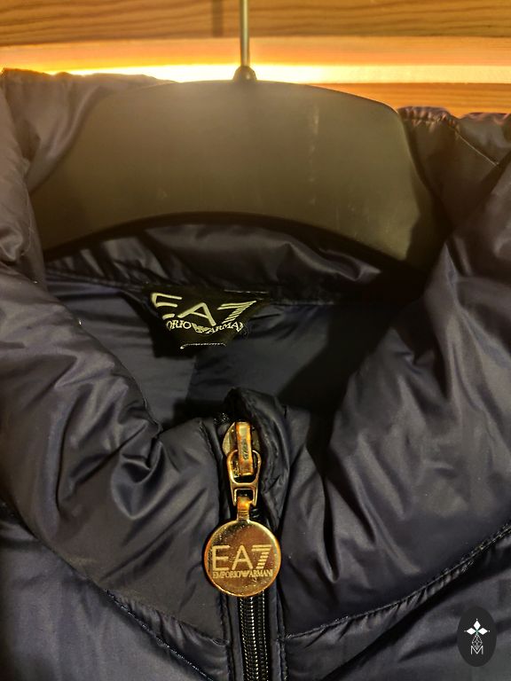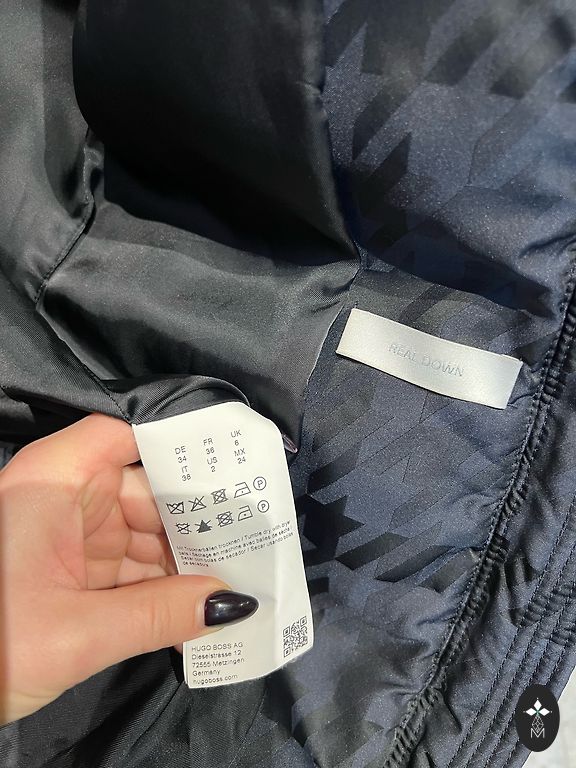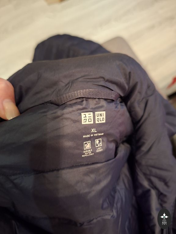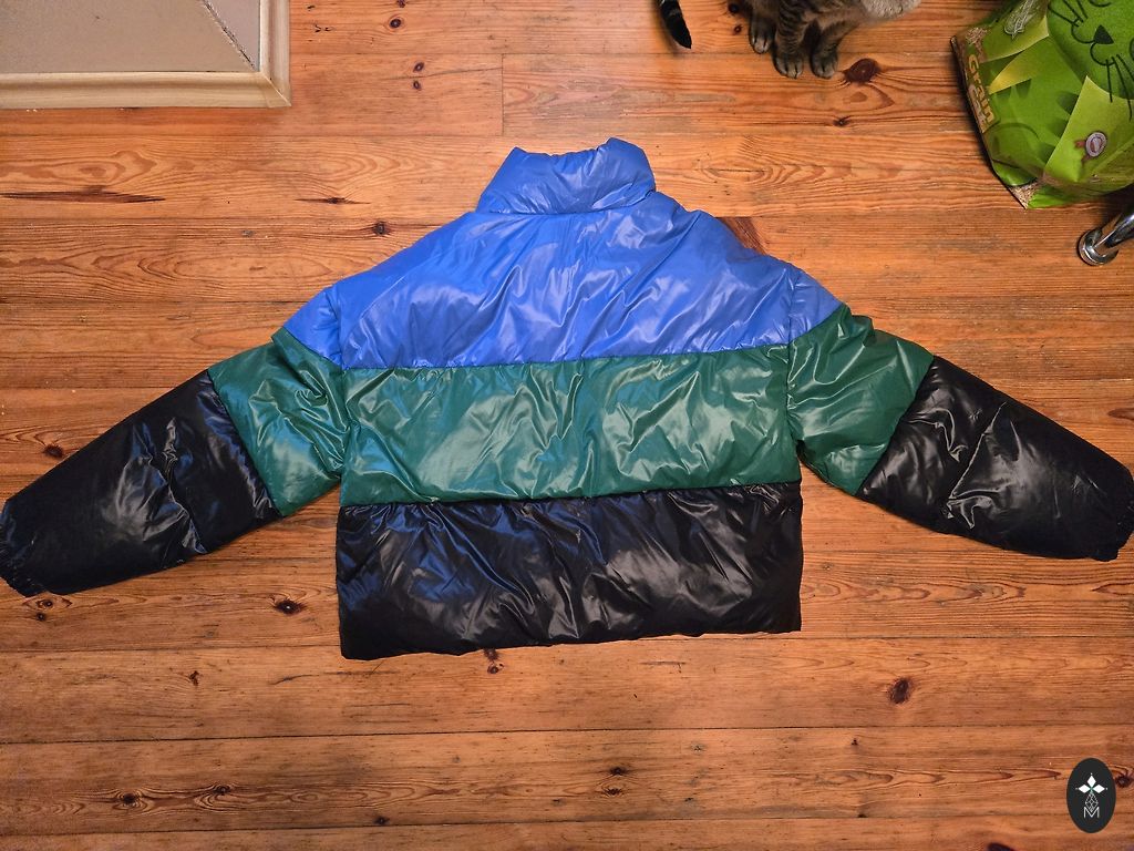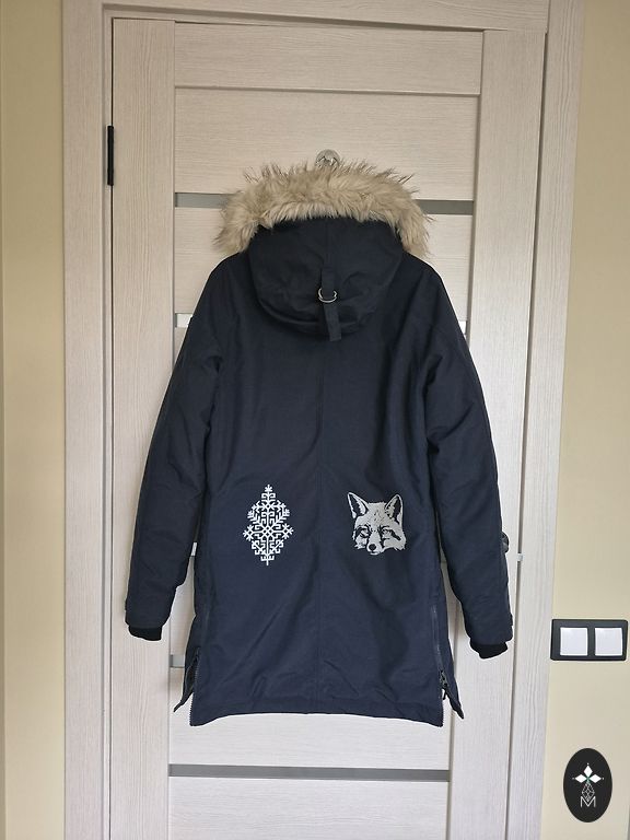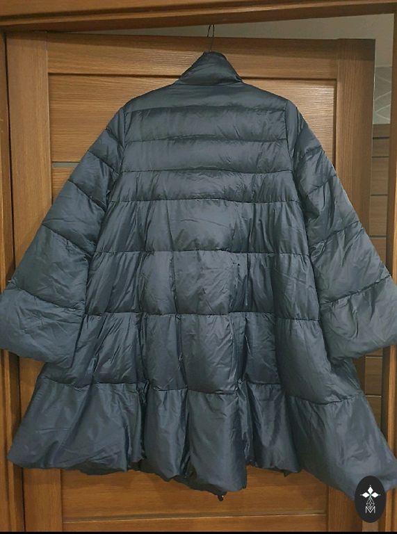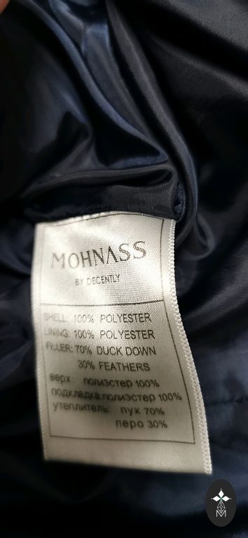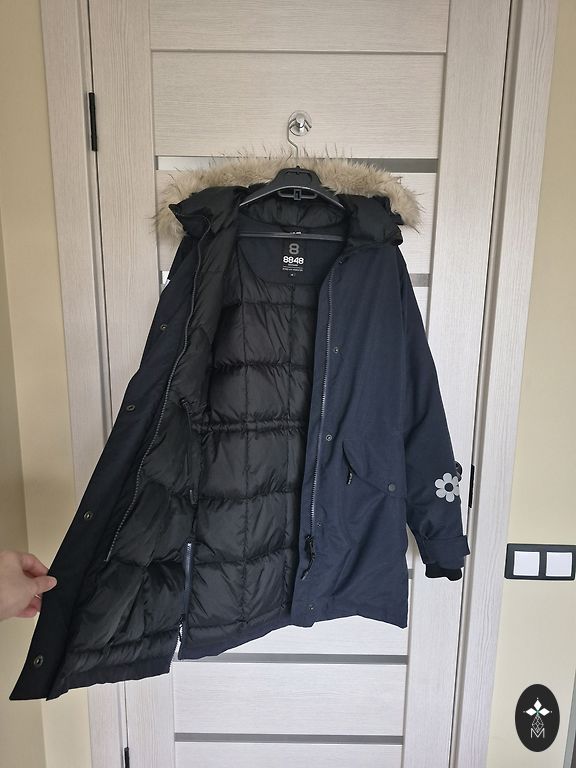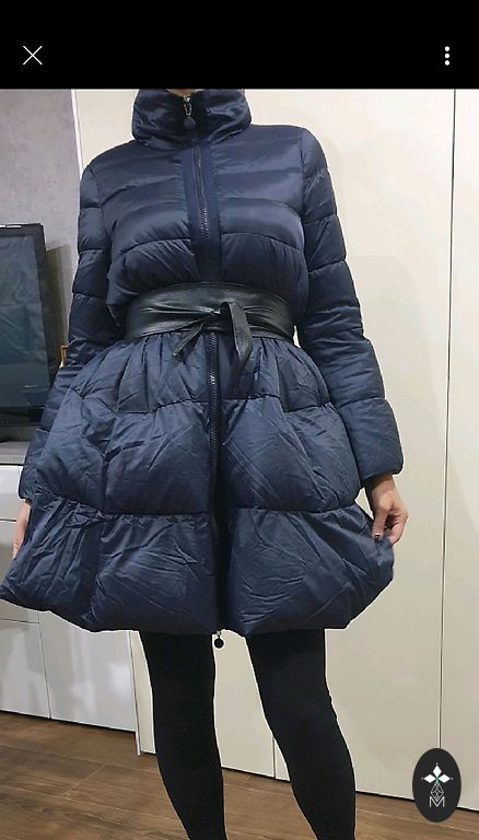 Tumesinine sulejope kapuutsiga. Kapuuts ei ole eemaldatav. Kantud ainult uks kord, kuna on jäänud liiga suureks. Väga soe ja kerge. Ees kaks taskut tõmblukuga. Pikkus-120 cm, kaenlaalused 57 cm.