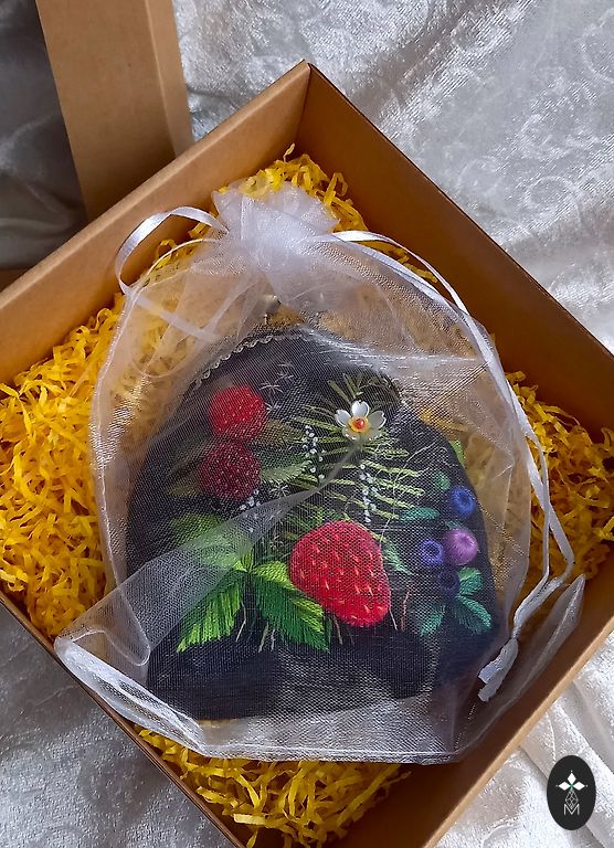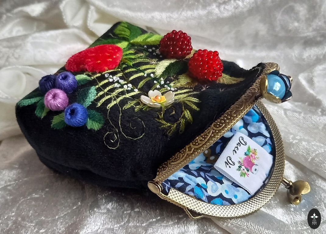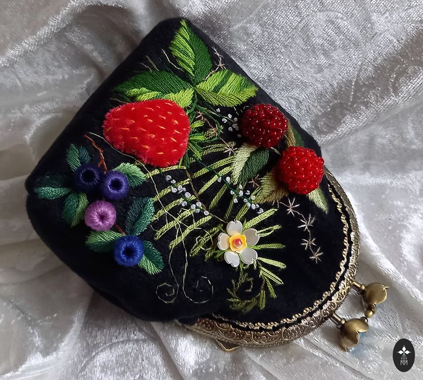 Ühelt poolt käsitsi tikitud sametkangast kott (muliné niidid, erinevad kangad ja helmed). Vooderdatud. Sobib hästi pisiasjade, ehete või kosmeetika hoidmiseks. Kõrgus kuni kinniseni 11,5 cm, laius 8,5 cm, sügavus 4 cm. Pakitud kingituseks organzakotti ja veel karpi!