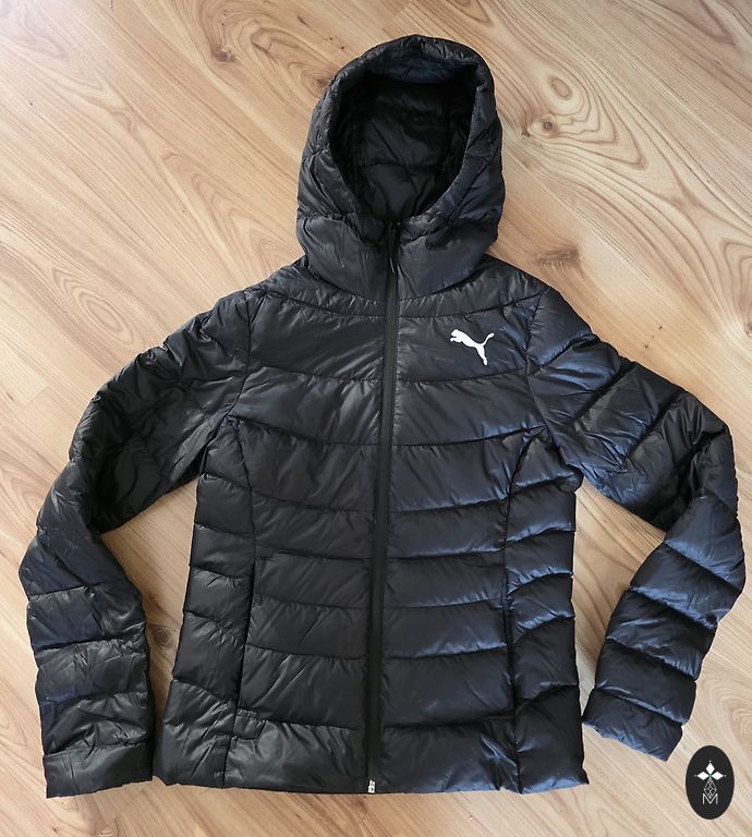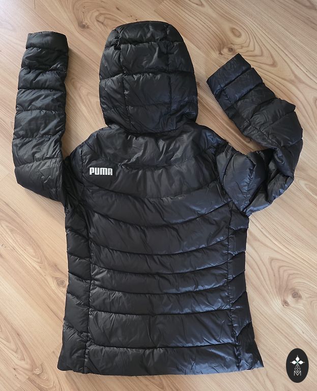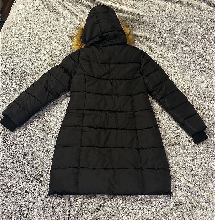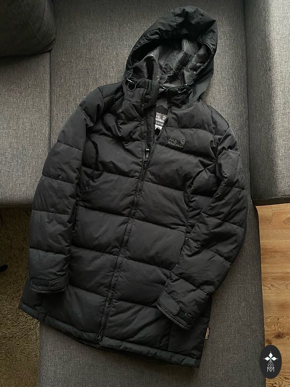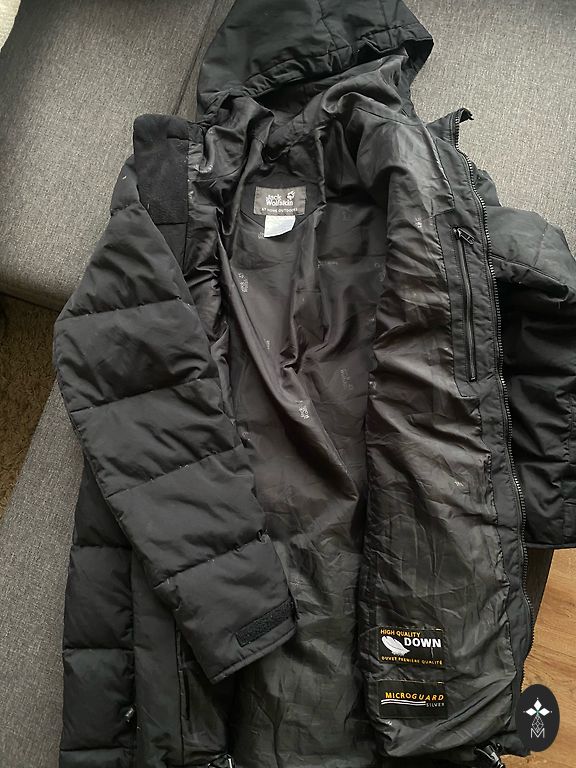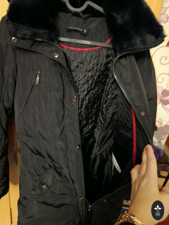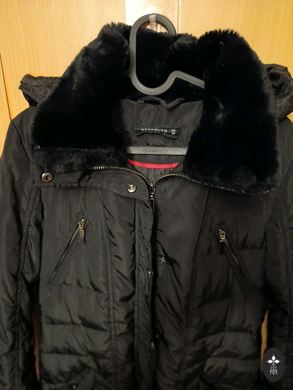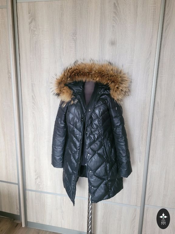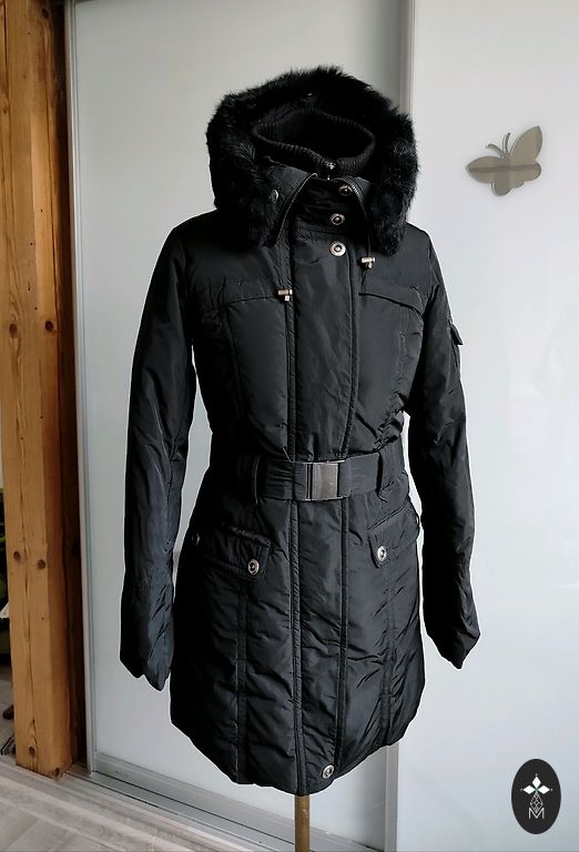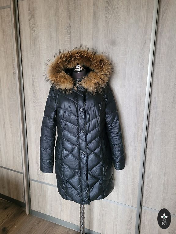 Black down coat with a large collar (no hood) and a belt. Very warm, lightweight. Elastic cuffs on sleeves, two pockets. Length approx. 105 cm, underarms approx. 60 cm. Worn very little, as it has become too large. Clean, without defects.