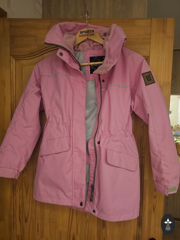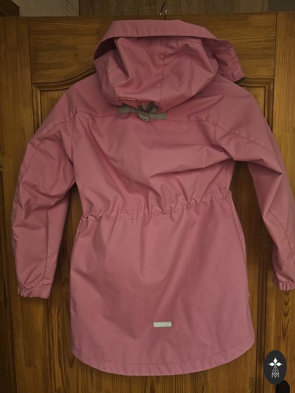 Šviesą atspindintis audinys ir šviečiantis raštas. Atspari vandeniui, vėjui ir purvui (DWR danga). Nuimamas gaubtas. Naudota kelis mėnesius. Puikios būklės.