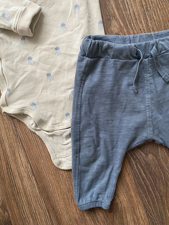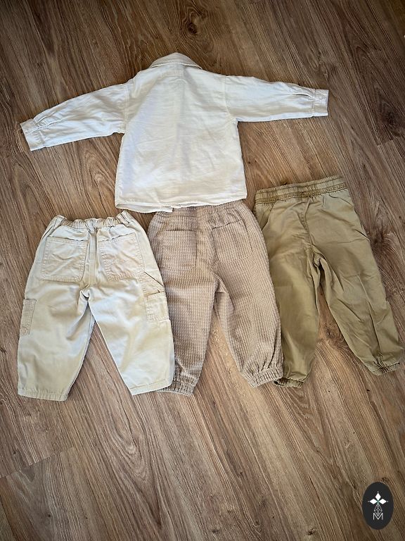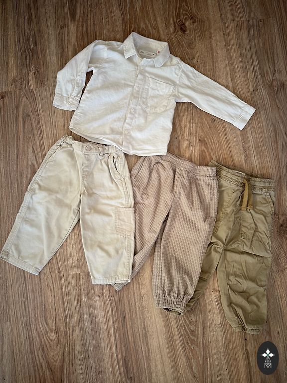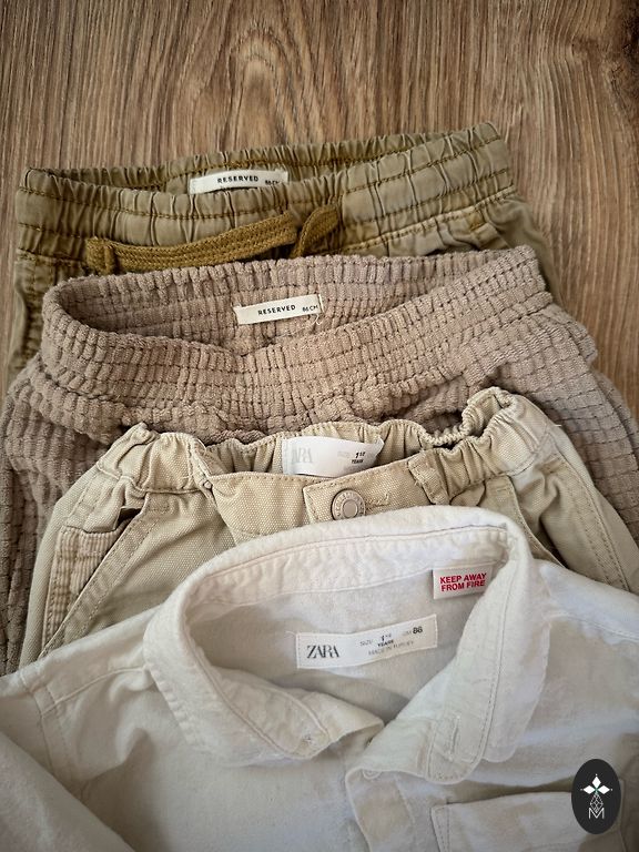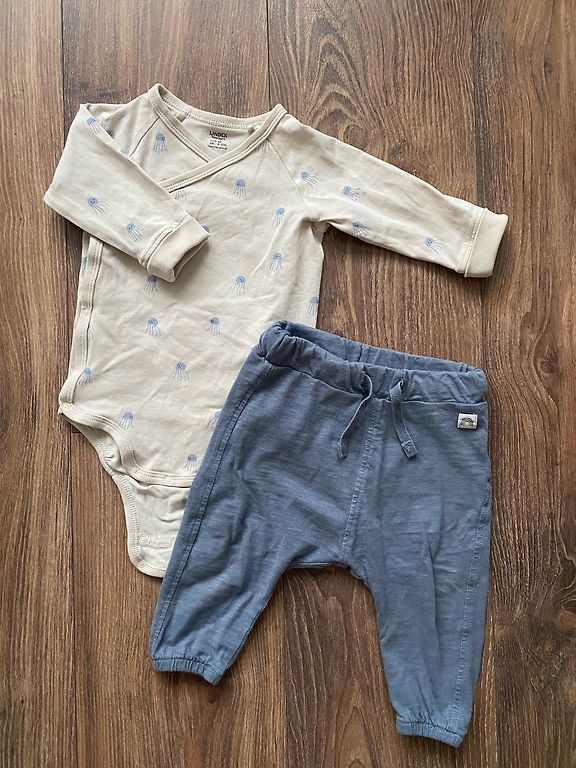 Lindexi superpehme velvetist väga mugavad püksid ja õrnalt kreemjas Newbie musliinsärk ilusa rebaseprintiga. Mõlemad suuruses 98. Kaunis komplekt, mis sobib nii igapäevaseks kandmiseks kui ka pidulikumateks puhkudeks. Pildistamisel avastasin, et pükstel on ees taskute vahel veidi kortsunud materjal ja särgil ühe manseti juures vaevumärgatav beež varjund, umbes küüne suurune. Pildil on seda raske tabada, näha ainult siis, kui väga lähedalt vaadata. Riided osteti uued, kandis üks laps paar korda pidulikeks