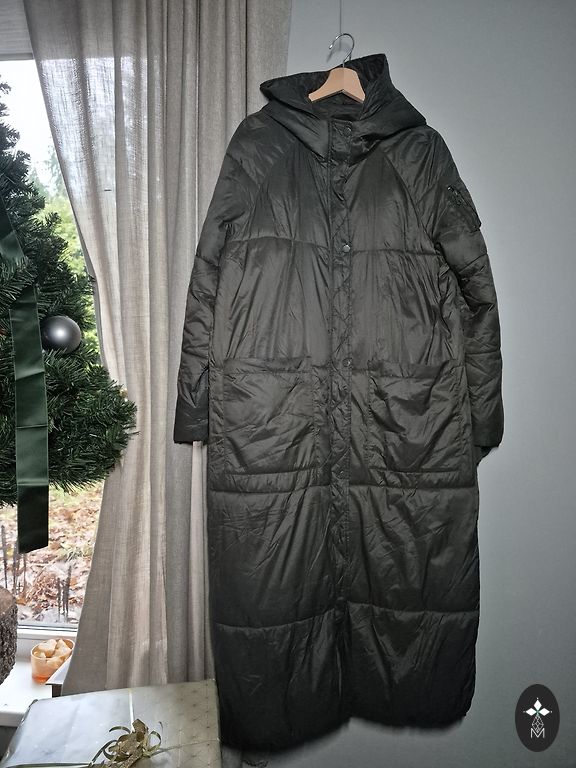 Uus, soe talvemantel pruun khaki tooniga (värv muutub sõltuvalt valgustusest). Varruka pikkus 67cm, õlad 42cm, rind 110cm, talje 102cm, puusad 112cm, pikkus 103cm. 4 lukuga taskut, mansetid, sügav kapuuts. Sobib M/L suurusele. Saatmine hinna sees.