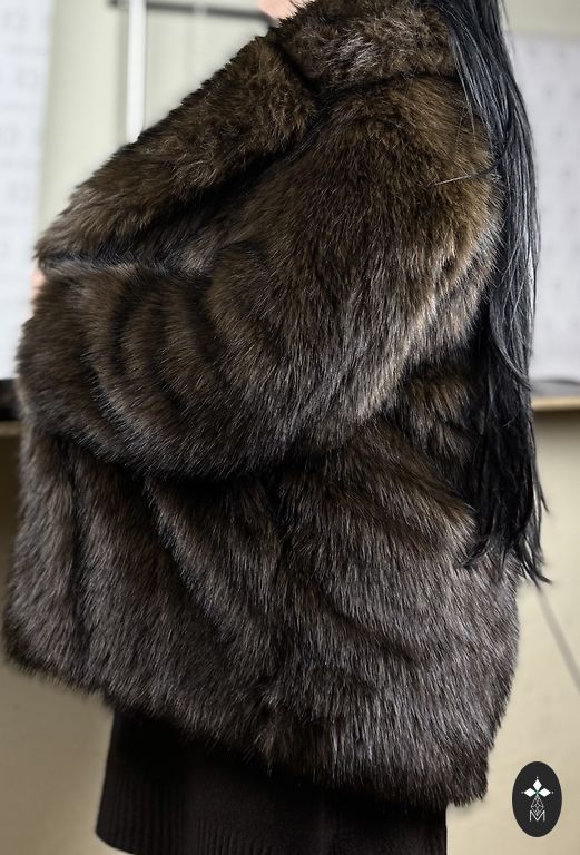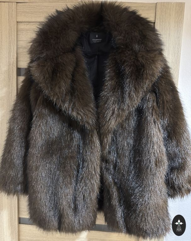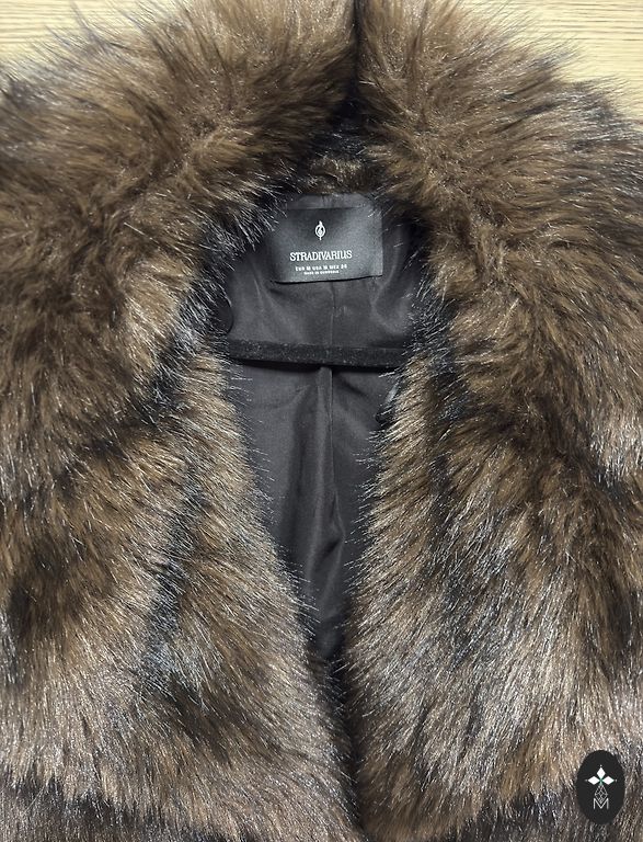 Artificial fur. Very fluffy and warm. Looks great with both pants and skirts, as well as dresses. Worn only a few times, didn't quite find its place in my wardrobe.