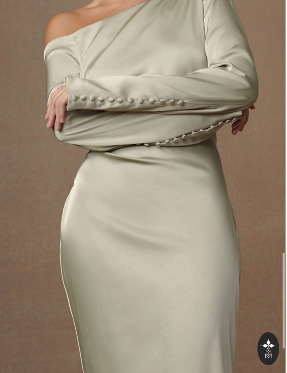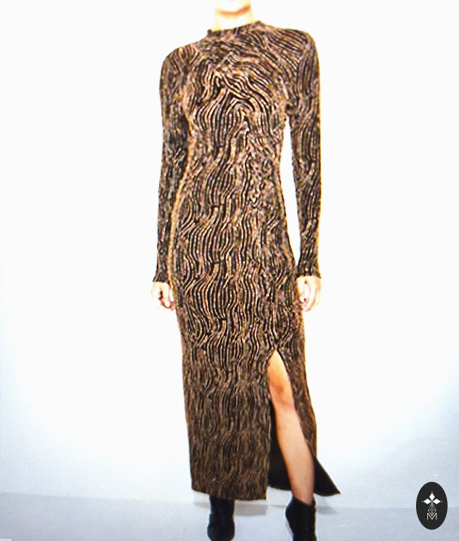Эластичное платье, с поясом, с карманами, не толстое. Два разреза спереди. Обхват груди 110-115 см, длина 130 см, обхват бедер 130 см.