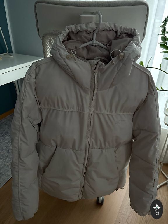 Šilta striukė, dėvėta vieną sezoną, kišenėse suplyšęs pamušalas.