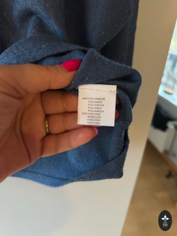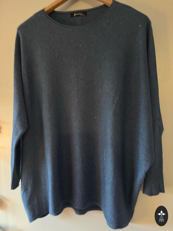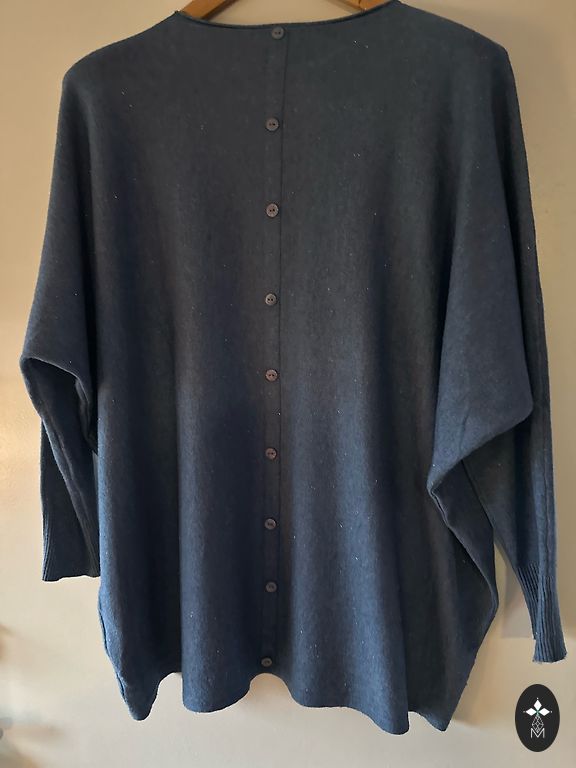 Новый, качественный свитер с кашемиром (кашемир 40%, вискоза 45%, эластан 15%). Темно-синий с фиолетовым оттенком. Не толстый, но очень теплый и мягкий. При необходимости, пуговицы по бокам можно расстегнуть. Размеры без растяжки: длина 62 см, обхват под мышками, в талии и бедрах 58x2 см, рукава от плеча 64 см.
