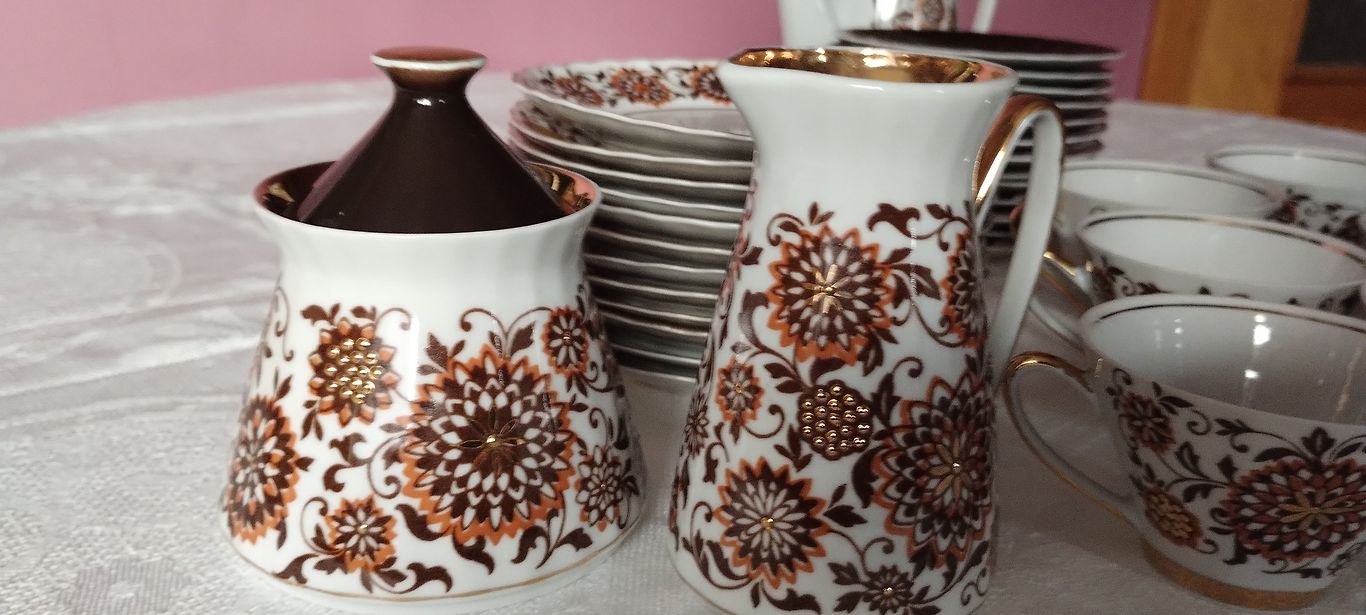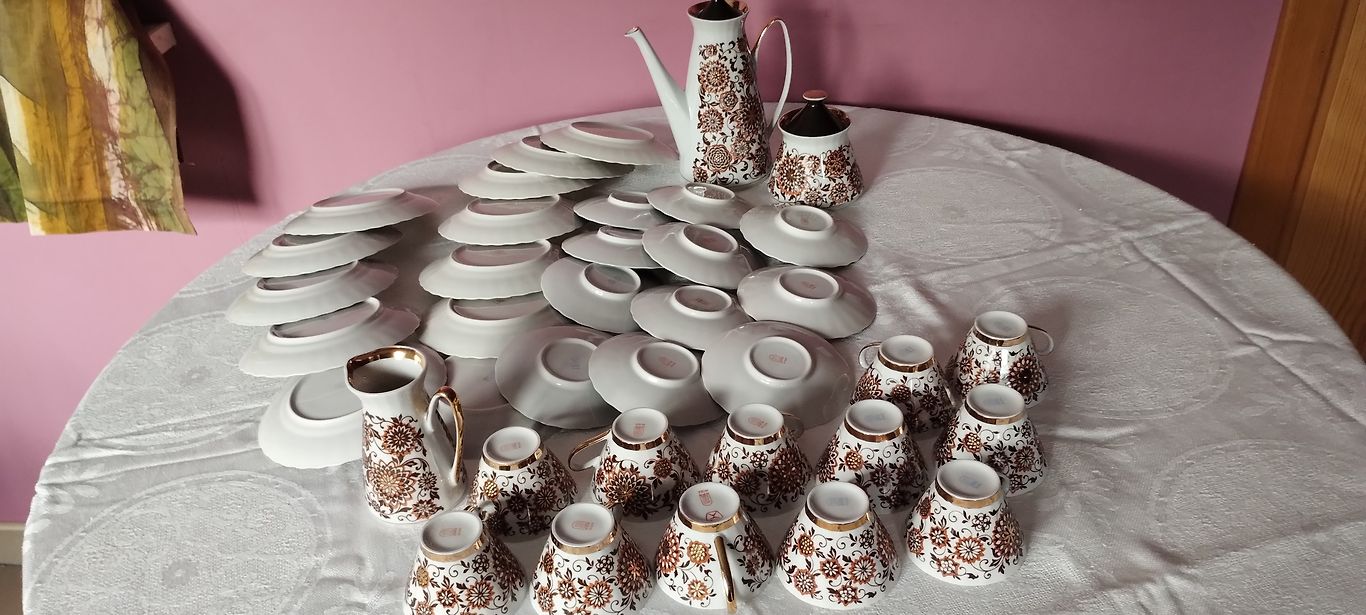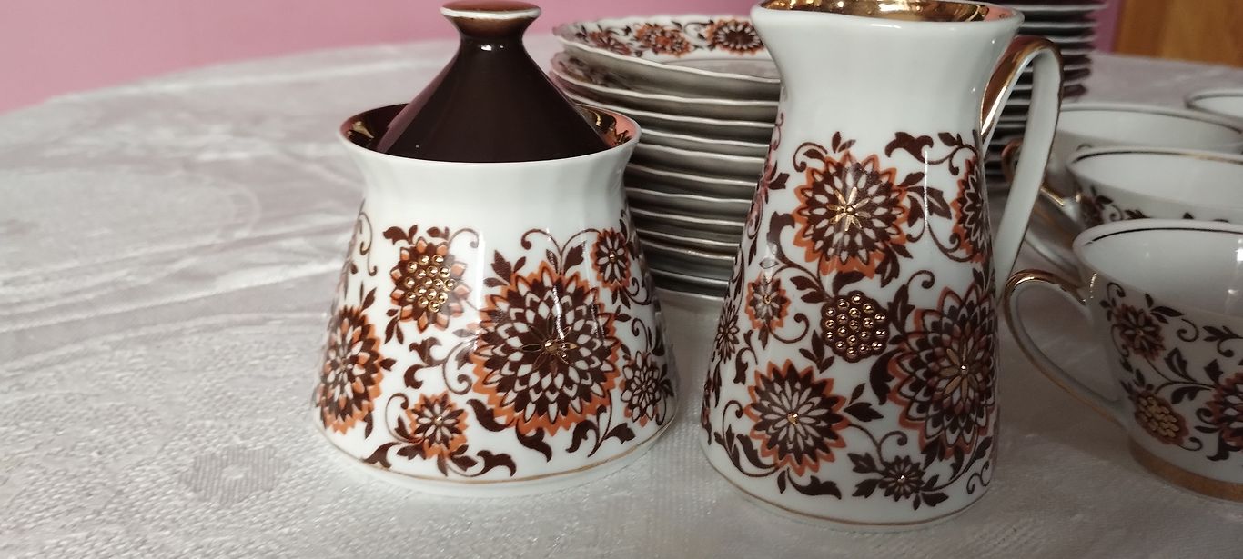 Кофейное трио из тонкостенной фарфоровой кофейной сервировки Марианна с черным народным деколем и золотом, ручная работа. Объем чашек 60 мл. В хорошем состоянии, без дефектов, на всех изделиях красная печать 1-го сорта. Сервировка Марианна произведена на Рижском фарфоровом заводе в период с 1972 по 1990 год. Красная печать RPR 1-го сорта.