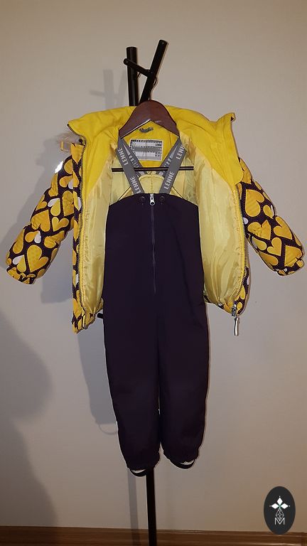 Зимний комплект Huppa размера 104. Очень теплый, а также выглядит отлично. Есть небольшие недостатки - колени стали светлее, и на одном из колен после постоянных падений в снегу есть 2 небольших изменения текстуры материала (2-е фото). Резинки на концах брюк уже не первой свежести, но свою функцию