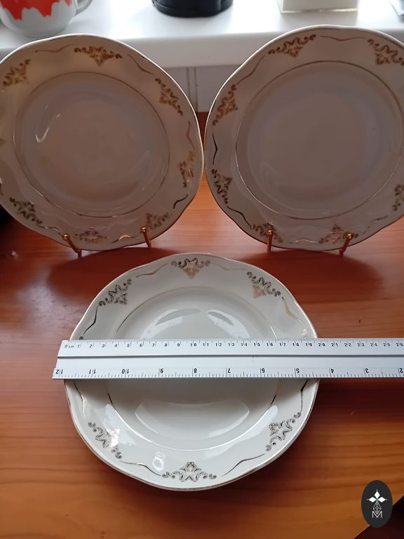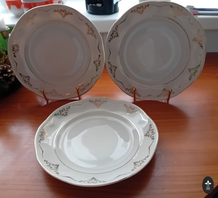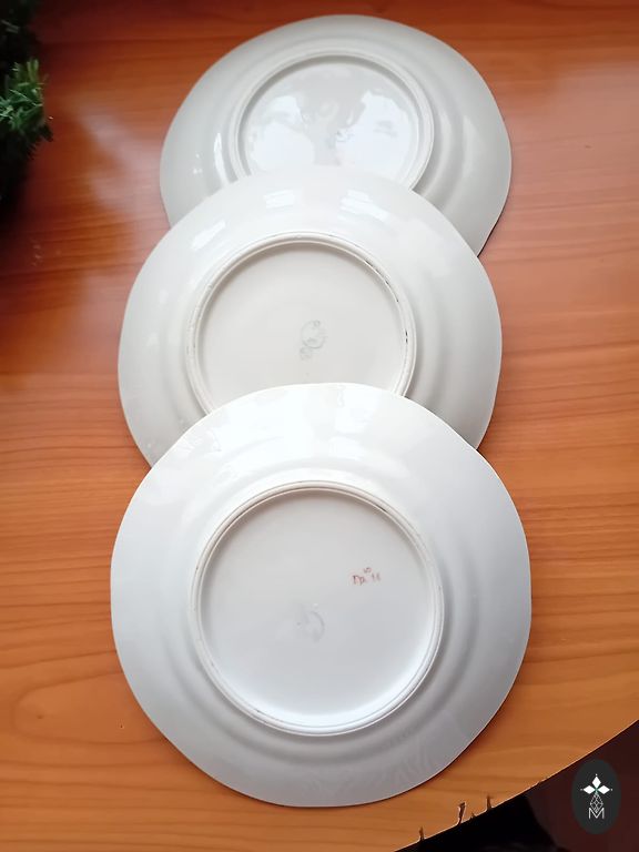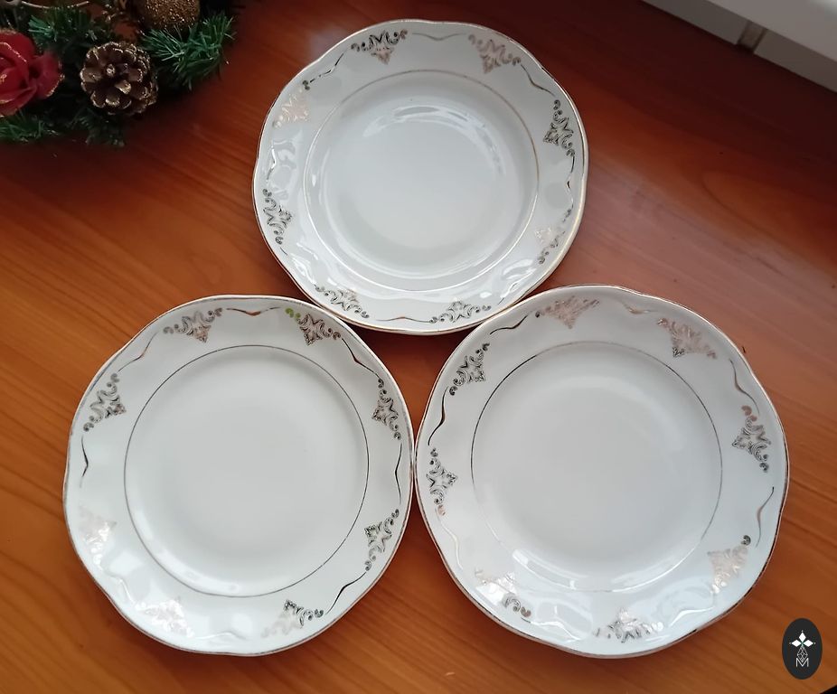Elegantiškos ir aristokratiškos vokiškos porceliano lėkštės iš Bavarijos, apie 1950–1960 metus. Kiekviena lėkštė dekoruota kobalto mėlyna fonu, paauksuotu graikų ornamentu ir ryškia gėlių kompozicija – klasikinis grožis, primenantis laikus, kai stalas buvo namų siela. Atsargus pristatymas po Latviją.