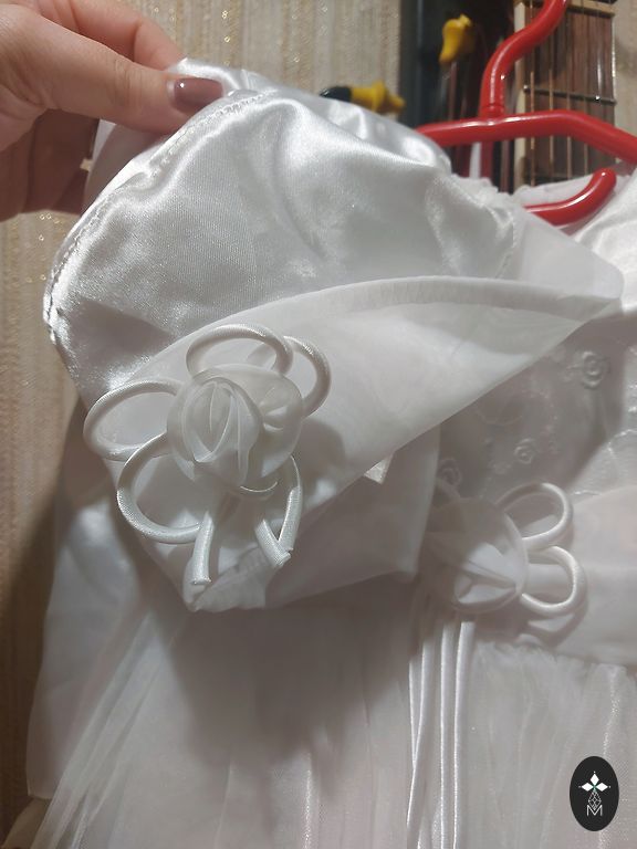 Из недостатков: в некоторых местах оторвана бусина, и на этом месте есть маленькое отверстие в ткани тюля. Тюль пышный, поэтому это трудно заметить. На подкладке есть одно маленькое пятнышко.