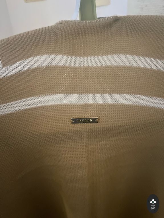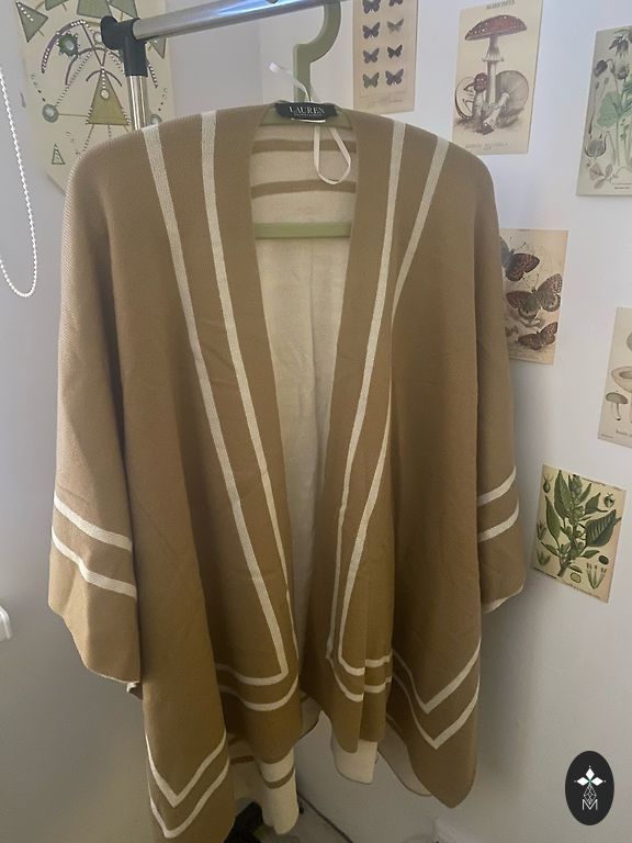 джемпер-пончо Maje в кремово-бежевых тонах с добавлением золотистых люрексовых нитей, свободный крой, фасон с рукавами «летучая мышь». Один размер-от С до Хл.