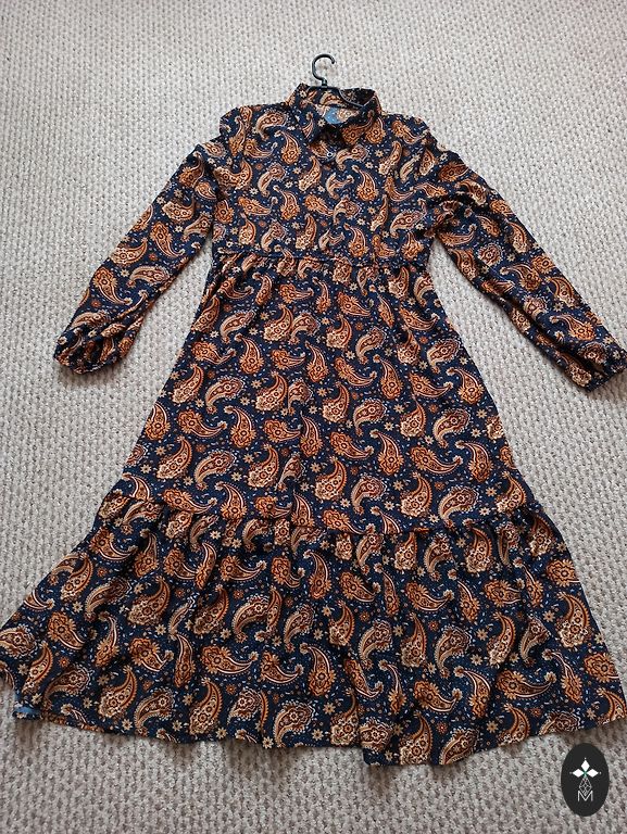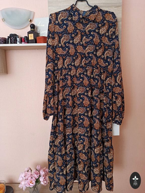 Ant suknelės nurodytas 46 dydis, tačiau jis labiau atitinka XL/44 dydį. Nugaros surišamas su plyšiu.