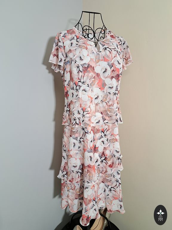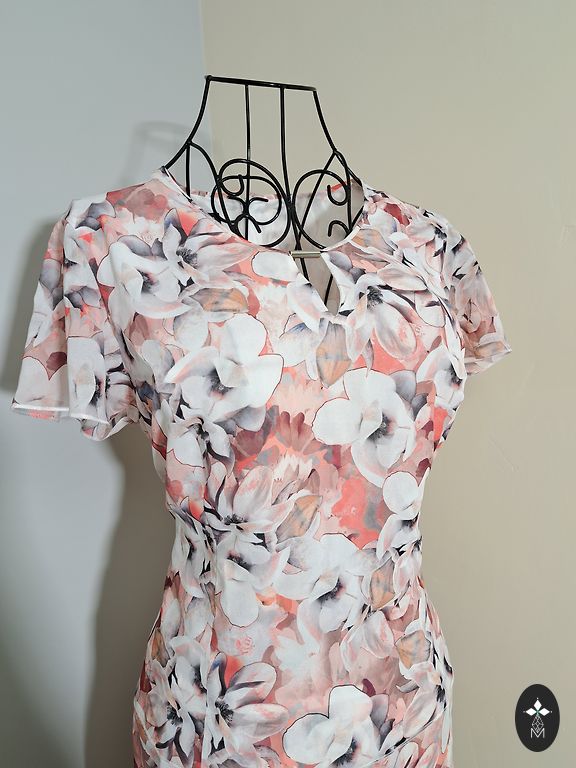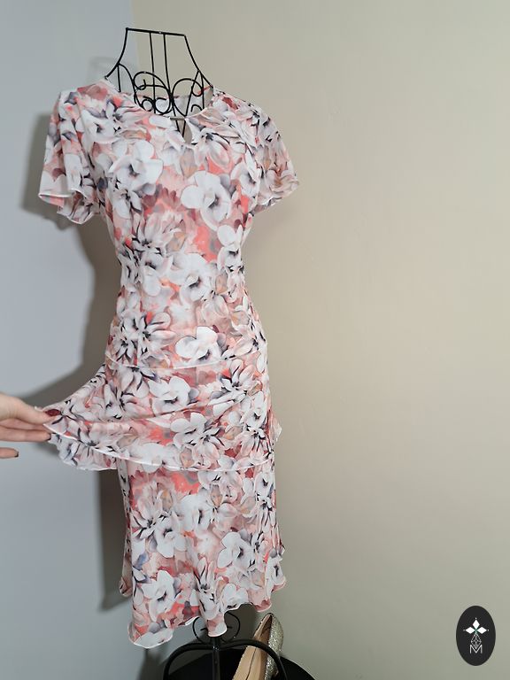 L dydžio suknelė. Ilgis 108 cm, po krūtine 102 cm. Šonuose surišama, bet nėra chalato tipo suknelė (juosmenį galima reguliuoti tik šiek tiek).