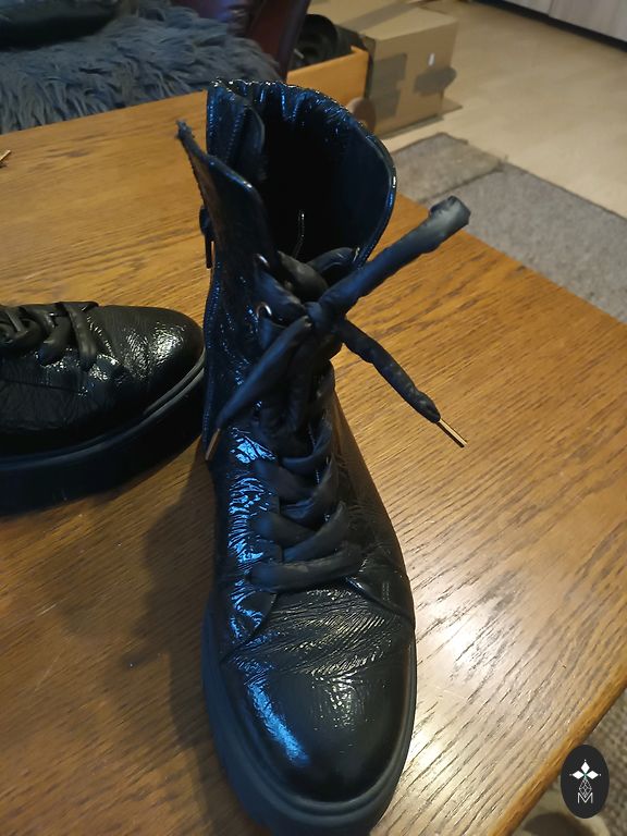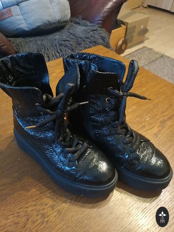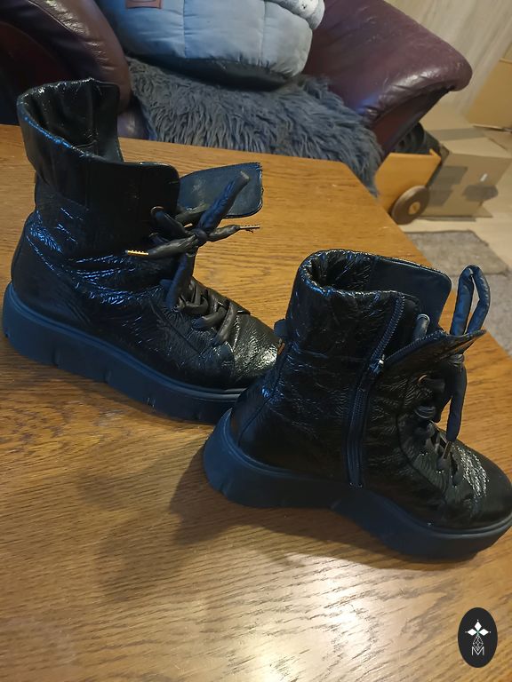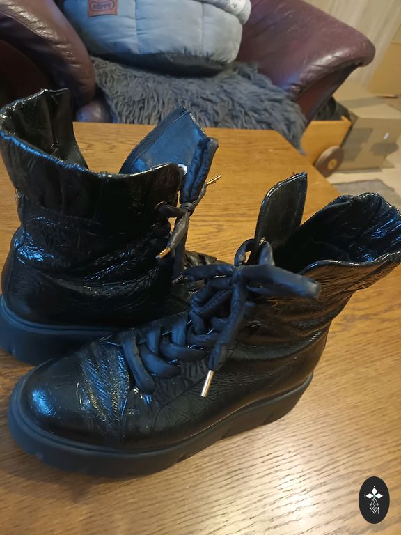 Sturdy wading princess boots, not afraid of ice and mud, easy to polish. Indicated size 40, but will fit 40.5 or 40 with a sock. The shoes are good for wearing in cold weather because the substantial rubber sole insulates the foot. For a stable step, they look excellent with fine, mouse gray suits and an orange pumpkin. One toe is slightly scuffed, as shown in the photo. No other defects, try running around with such a thick sole yourself!