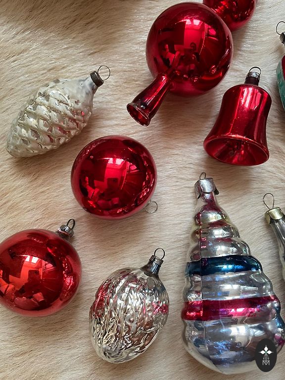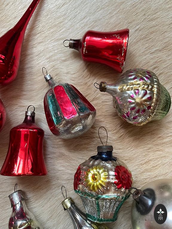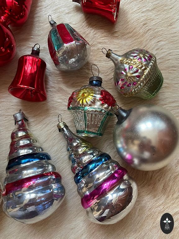Soviet Christmas ornaments made of glass and plastic balls in a large box. Some ornaments have hidden defects, chipped tubes, paint wear in places, vintage condition. Riga, I send via parcel locker +2€, securely pack each ornament.